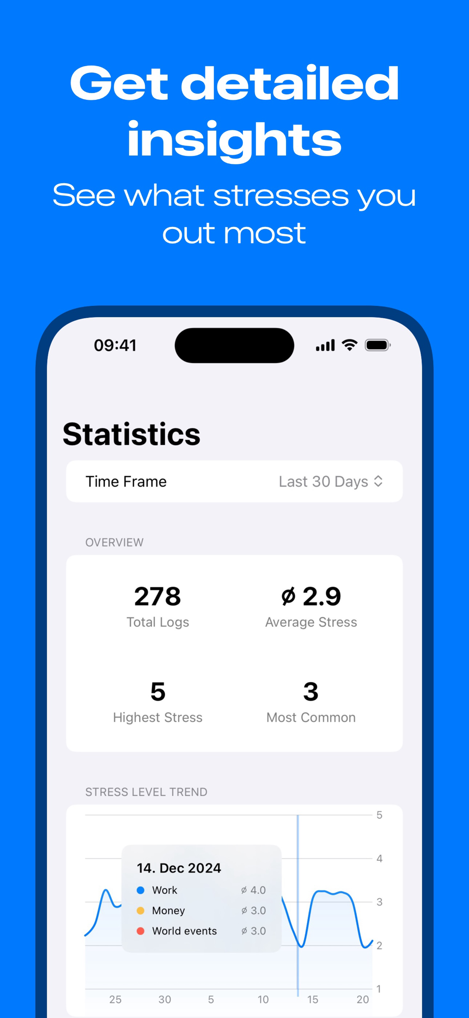 Keep track of what stresses you out and gain valuable insights into your daily stress levels. Stresslog helps you identify patterns and understand what impacts your well-being the most.