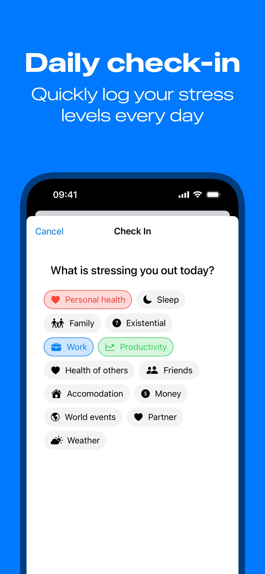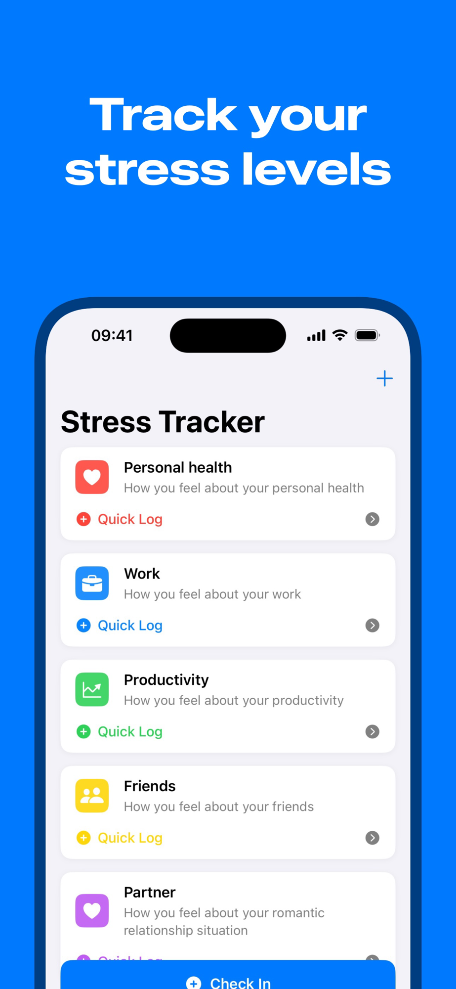 - Quick and easy stress logging with customizable categories