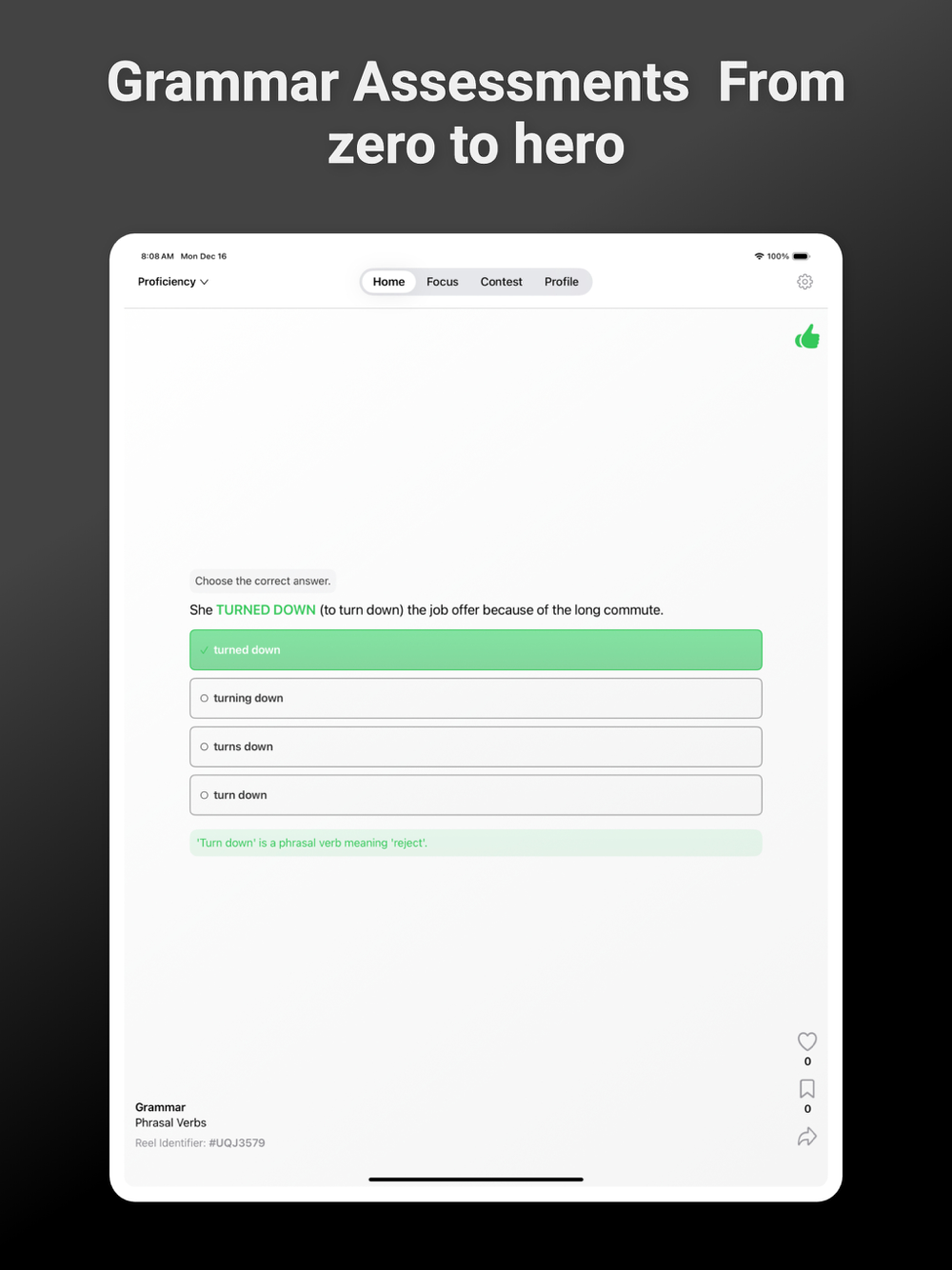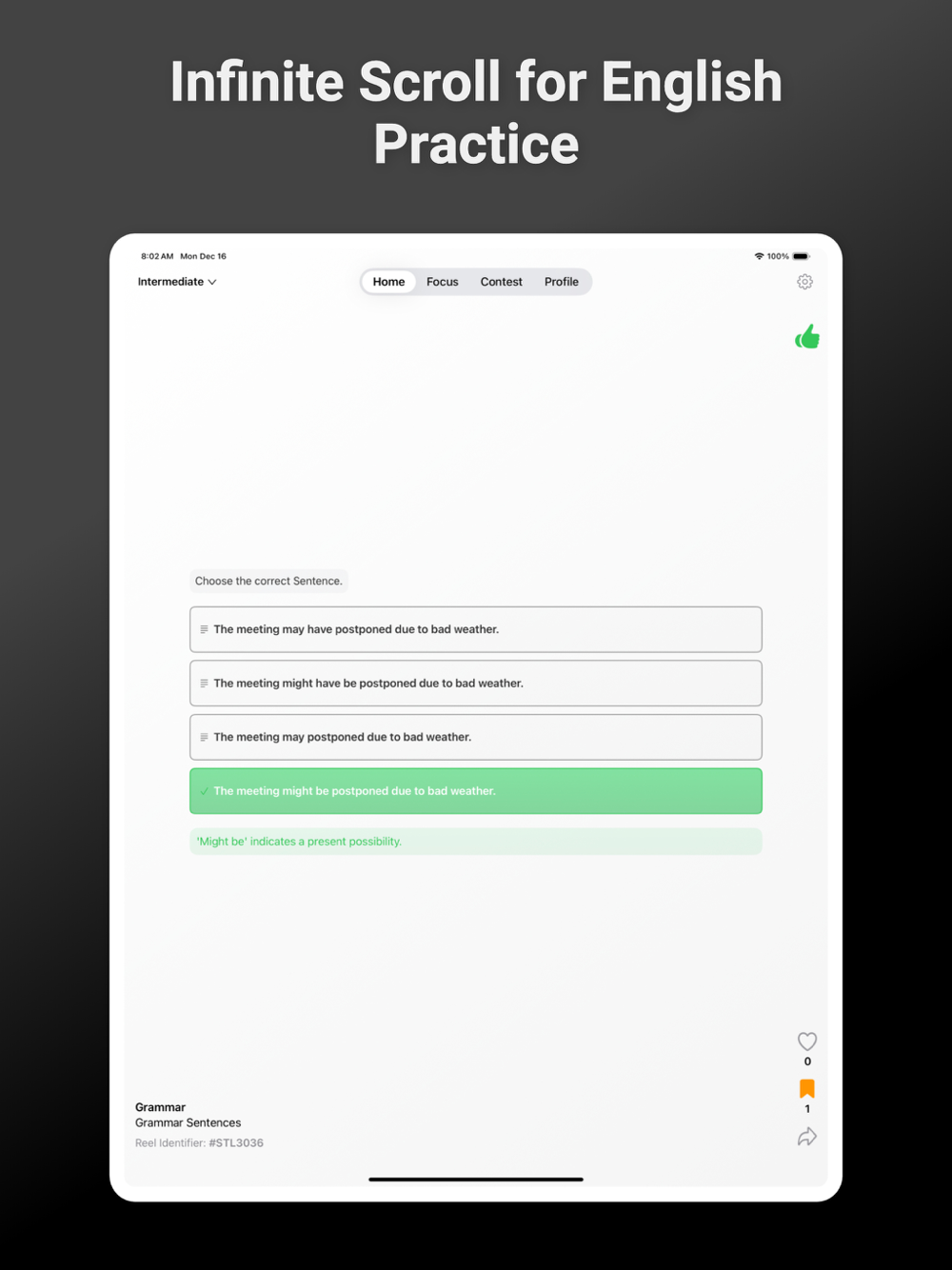 Challenge yourself with fun English reels! Scroll through endless grammar, vocabulary, and quiz exercises to master English while having fun.