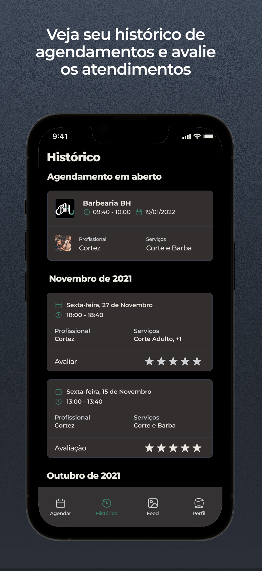 Através do App Barbearia BH os clientes podem realizar seus agendamentos de uma forma muito mais prática. Na tela inicial, é possível selecionar os serviços e horário desejado para seu próximo atendimento. Já na tela de histórico, você poderá avaliar como foi o seu atendimento, remarcar ou cancelar seus agendamentos. É possível também na tela do perfil o cliente editar suas informações, como e-mail, foto de perfil e telefone.