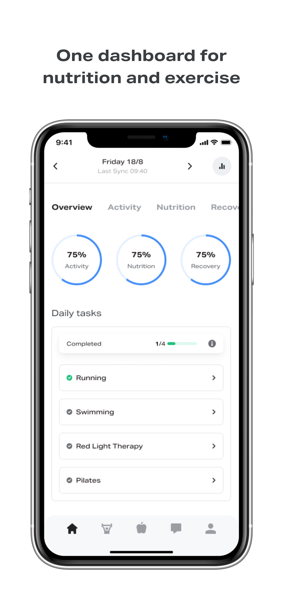 • Dashboard with activity, nutrition, recovery, and metabolic data.