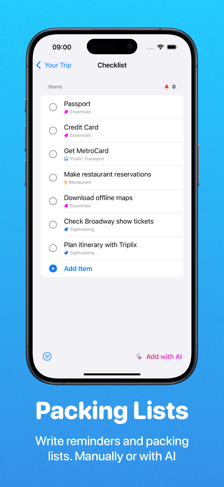 - Packing Lists Made Easy: Don’t forget a thing! Create customized packing lists or let the AI populate them for you. Receive timely reminders with push notifications.