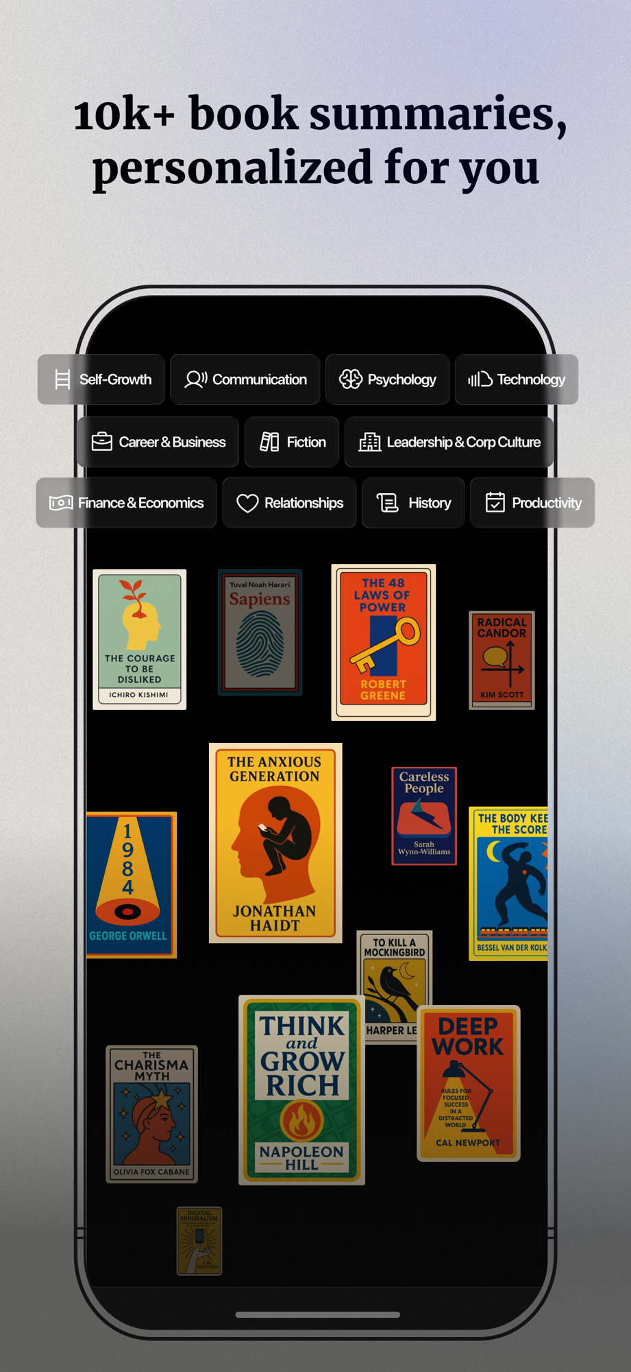 - Ever-Expanding Library: Browse books on productivity, entrepreneurship, personal development, science, and more.