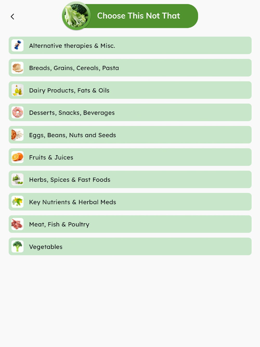 • Food Suggestions. The best food choices within a food group, based on your personal profile. An extremely valuable tool when at restaurants or when grocery shopping. Over 850 natural food items and growing number of recipes are included.