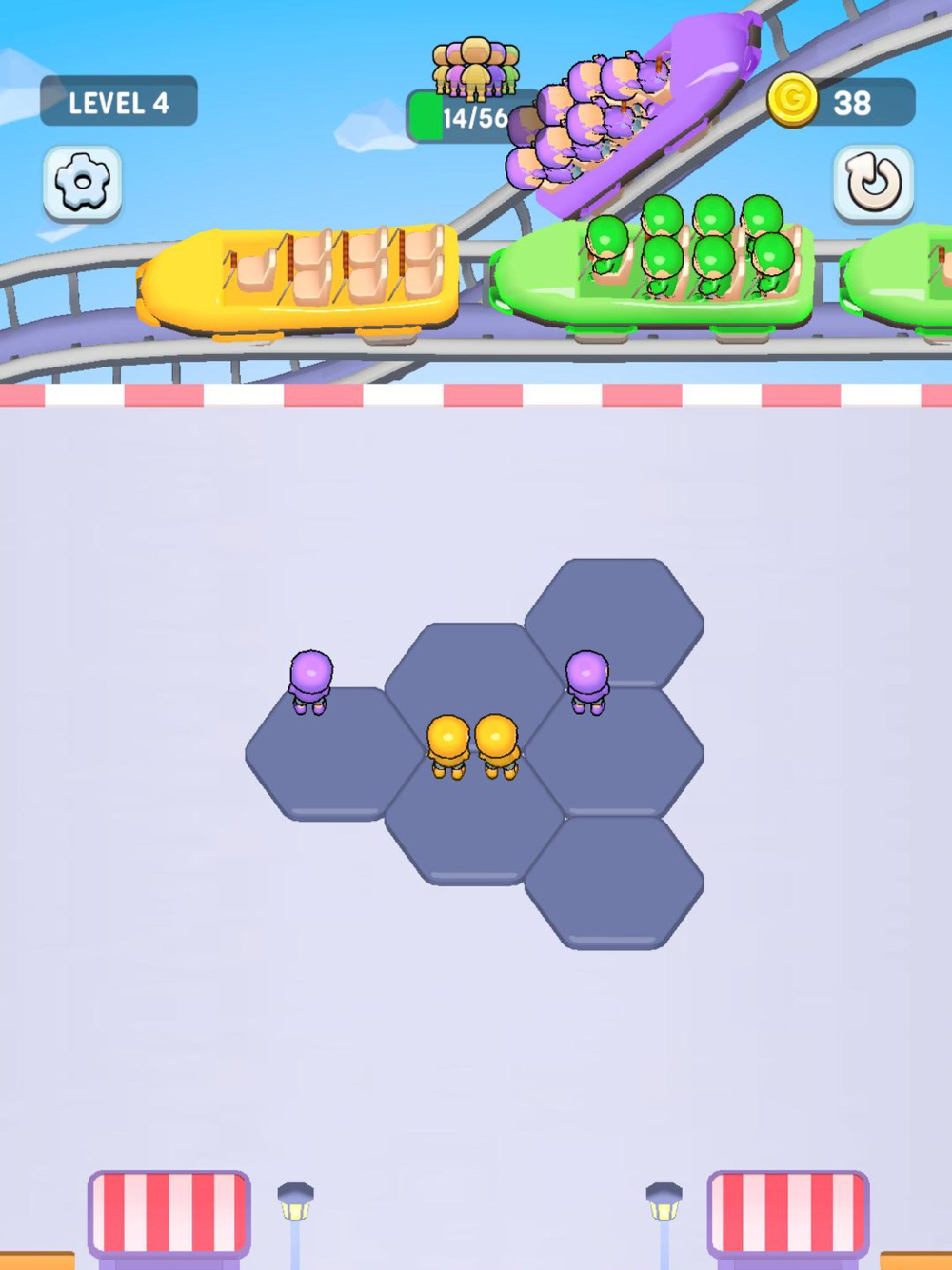 Clear the Grid: Group seven matching-color visitors on a single grid tile to clear them, sending them onto the park ride carriages.