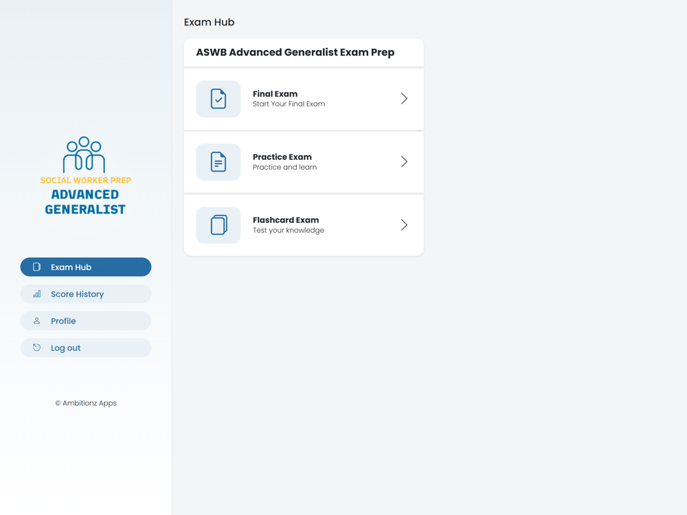 Our app is designed specifically for the ASWB Advanced Generalist Exam, with up-to-date content and features aligned with the latest exam requirements. Whether you’re a first-time test taker or retaking the exam, our tools will help you feel prepared and confident.