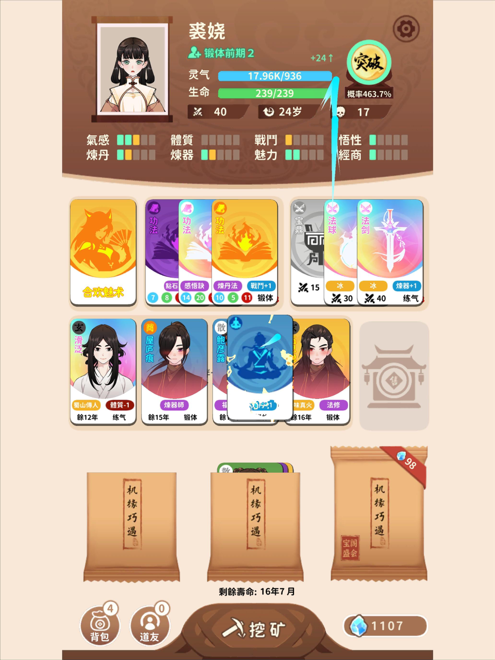新增特殊修士【金曜】新增传承卡《云游手札》新增新的轮回星图和新的事件卡[天络令]特殊修士【风灵希】立绘重做调整卡进背包后的顺序逻辑《真鬼谷卦术》调整,现在可以删除死劫的同伴了《龙纹木戒》快速杀敌获得的浴血量略微下调宝阁盛会的商品数量减少灵石变动时增加新的动态效果-修复内购丢失bug(重新购买可以恢复)-修复新的传承卡无法解锁的bug