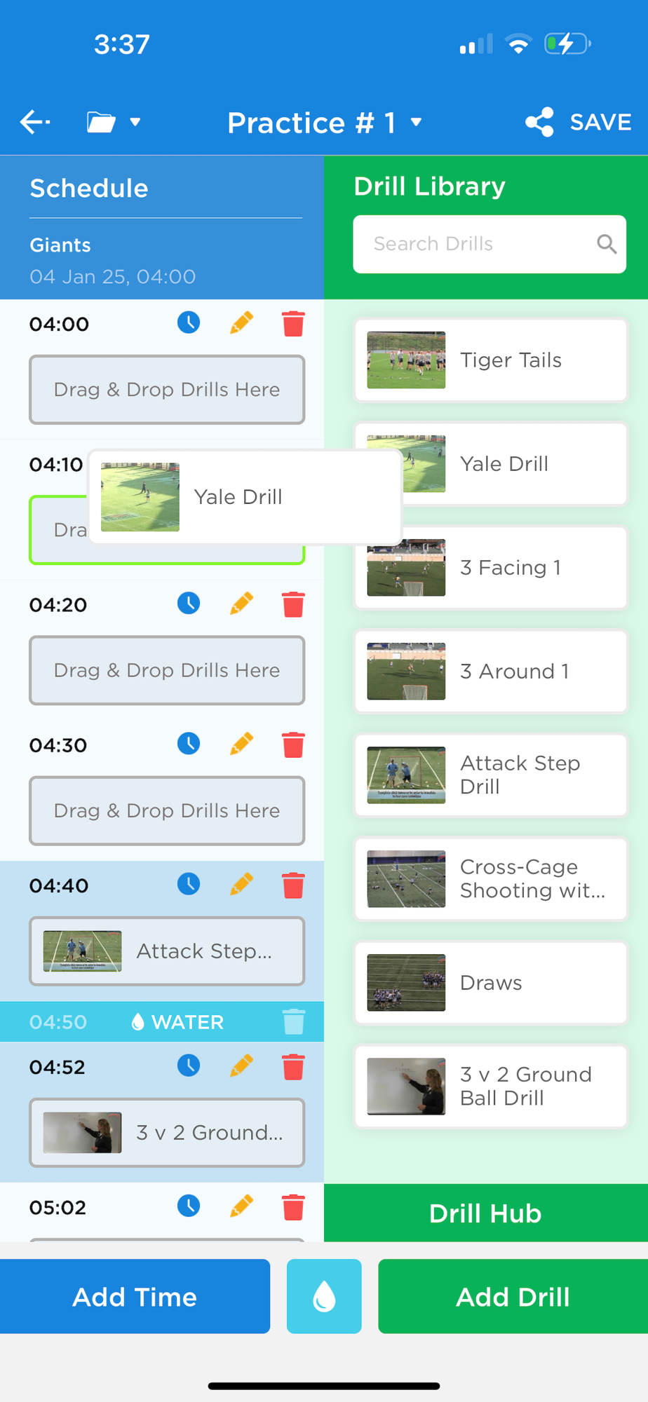 Build practices by dragging and dropping a drill from the right side of your screen to the left side. Customize your practice by adding water breaks and adjusting time periods.