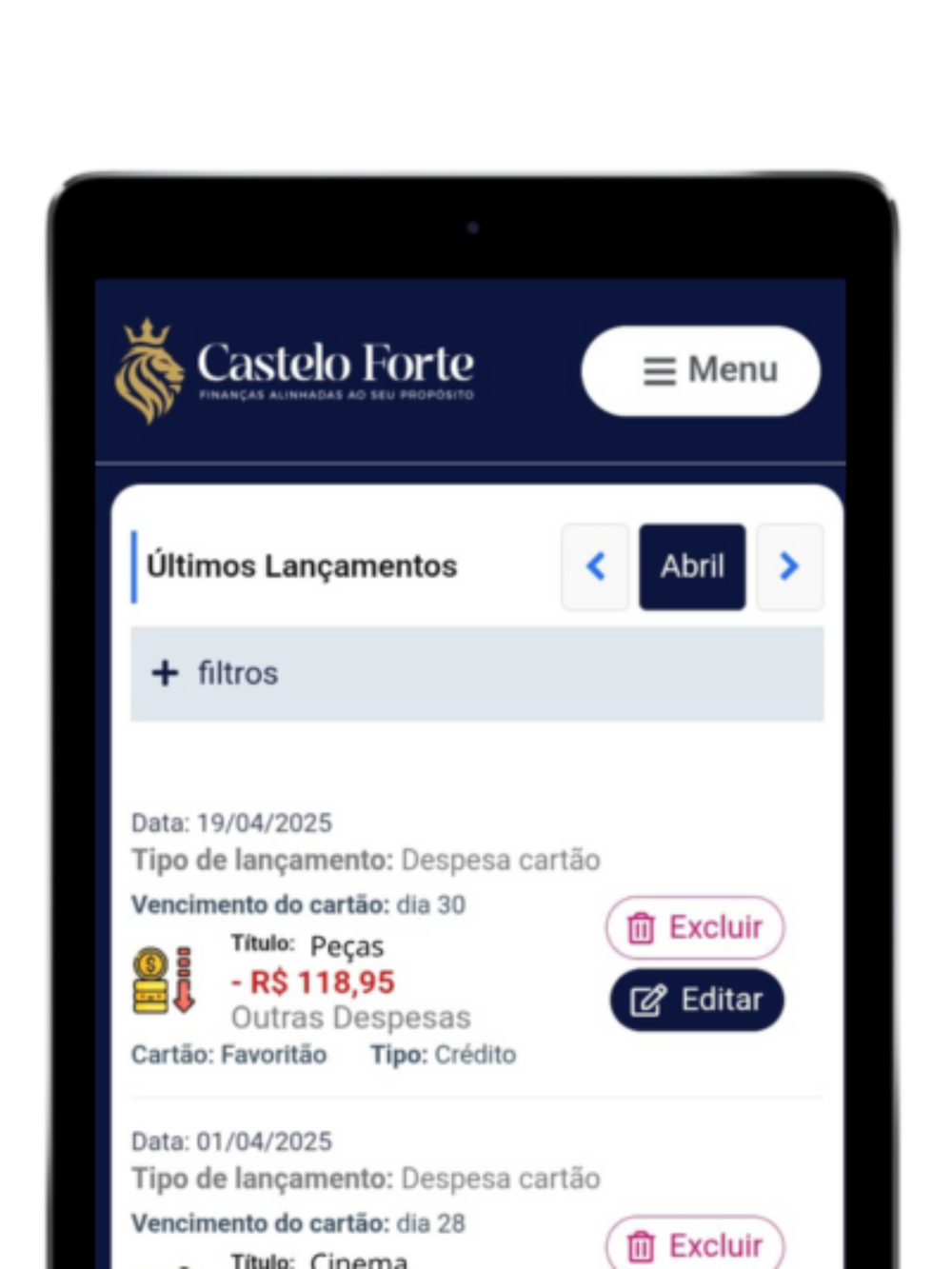 O aplicativo CASTELO FORTE foi desenvolvido para ajudar você a gerenciar suas finanças de forma prática e intuitiva. Com ele, você pode controlar seus gastos, acompanhar suas receitas, planejar orçamentos. Ele oferece gráficos detalhados sobre sua situação financeira para um controle mais completo. Além disso, com ferramentas de planejamento, você pode alcançar suas metas financeiras com mais facilidade e segurança.
