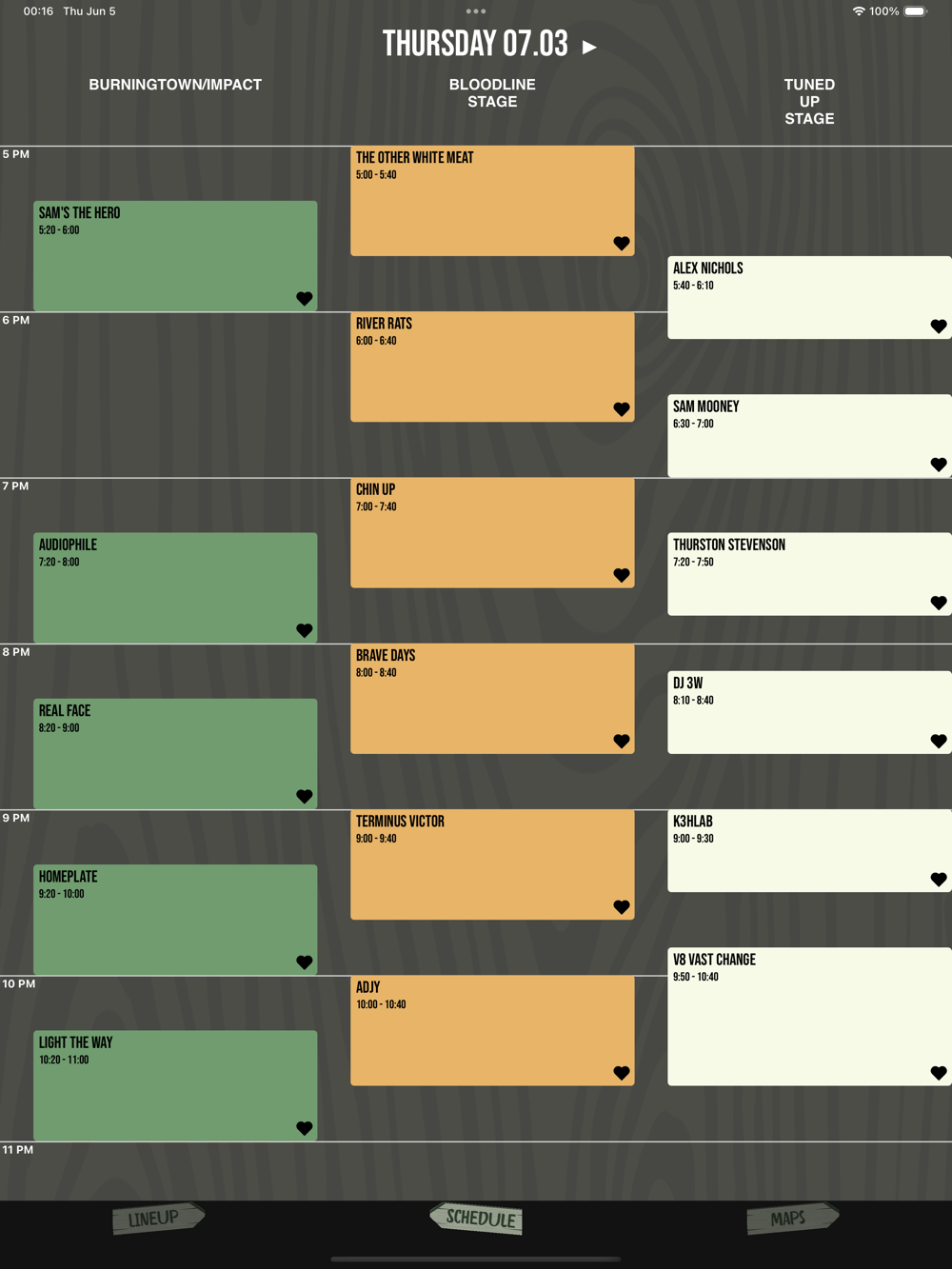 * Stage schedules -- View up-to-date stage schedules for each day of the festival. Swipe through the four days and see when and where your favorite bands are playing. Tap on a band's set to "heart" it, and you'll get a push notification before the performance begins.