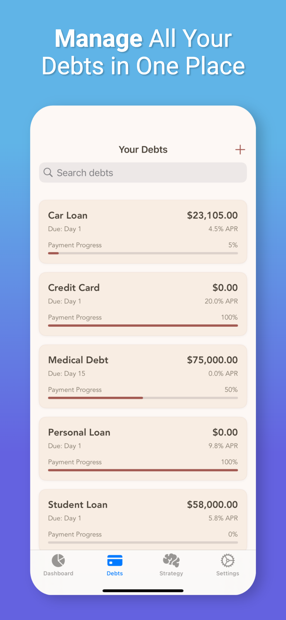 • Add unlimited debts and track payments