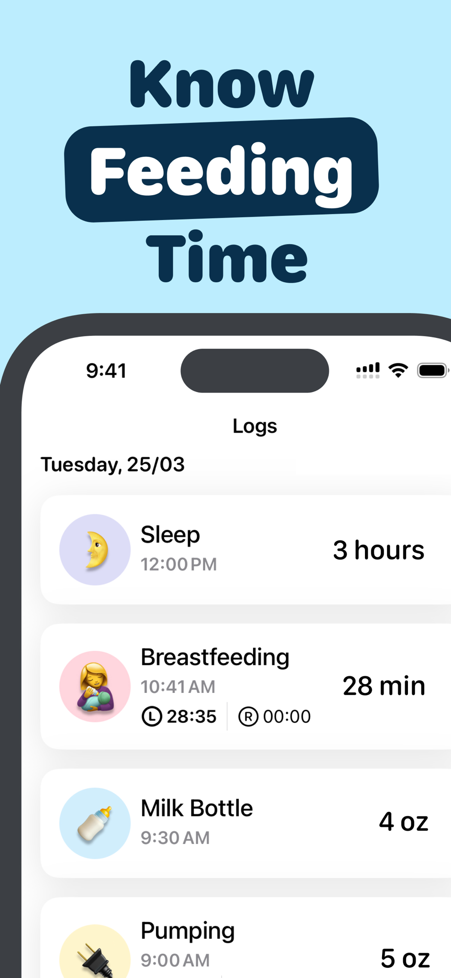 * Log breastfeeding, pumping, bottle feeding, and sleep with one tap