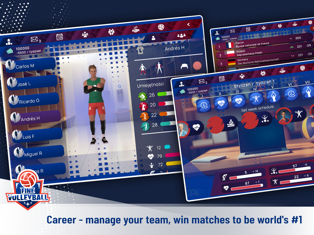 Step into the role of a coach and take control of a men’s or women’s team. Your goal is to lead your squad to the top of the world rankings! In career mode, you manage not only the lineup and strategy but also:
