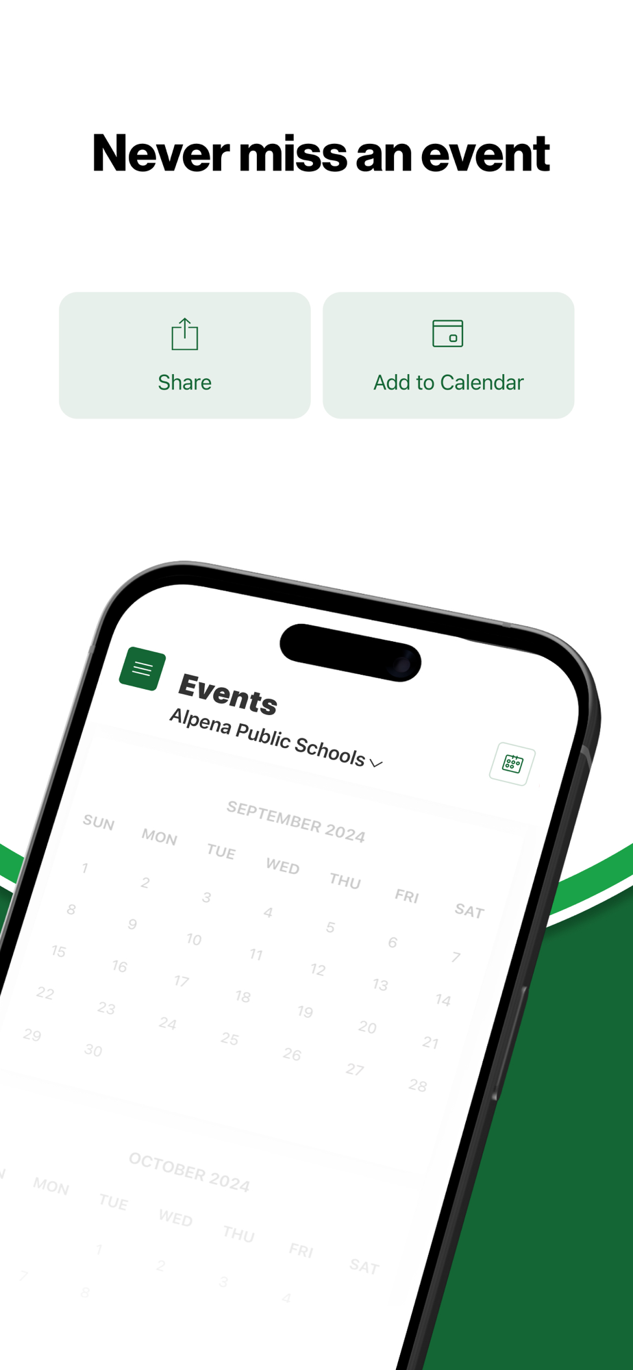 The event section shows a list of events throughout the district. Users can add an event to their calendar and share the event with friends and family with one tap.