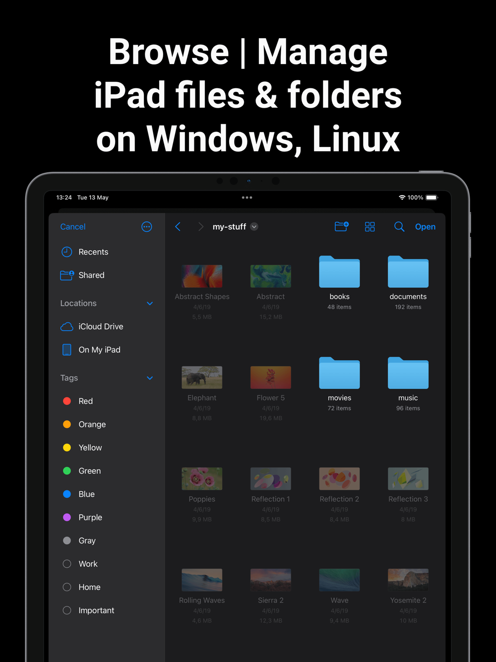 Access, browse, stream, and manage iOS or macOS files and folders from Windows, Ubuntu, macOS, Android, etc.