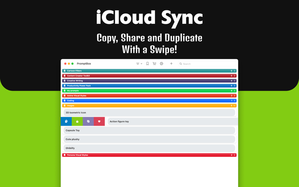 Your prompt library stays up-to-date across iPhone, iPad and Mac.