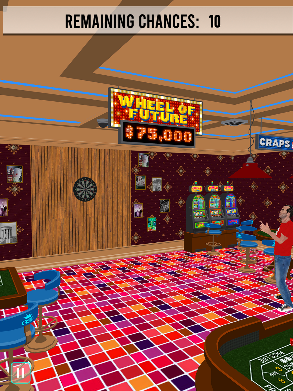 Step into the peaceful world of a village, where your aim and precision are put to the test. The game starts with the player entering a cozy village bar. At the reception, they exchange money and receive the necessary tools for the challenge. After this small interaction, the player walks over to the central area where the target is waiting.