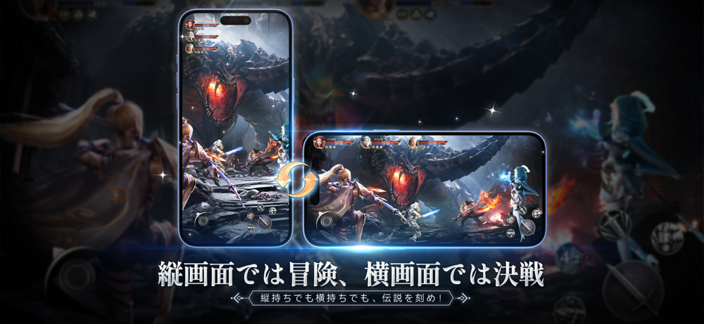 縦画面は片手で操作可能、冒険はより便利に。横画面は広い視野で局面を把握可能、熱血の戦いを楽しめる。