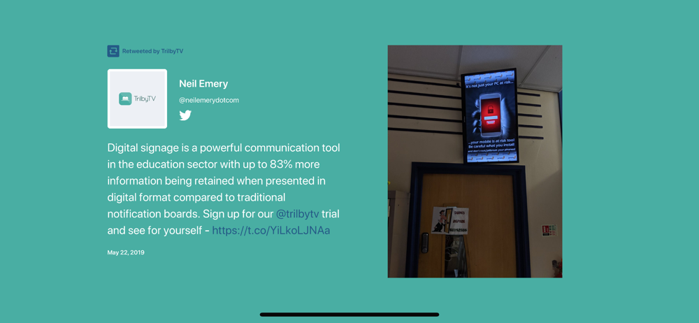 TrilbyTV is the easiest to use digital signage solution on the market and the only one specifically designed for education. With a set up time of less than 10 minutes, TrilbyTV allows for a variety of full screen content to be showcased including video, twitter feeds, web content and image galleries.