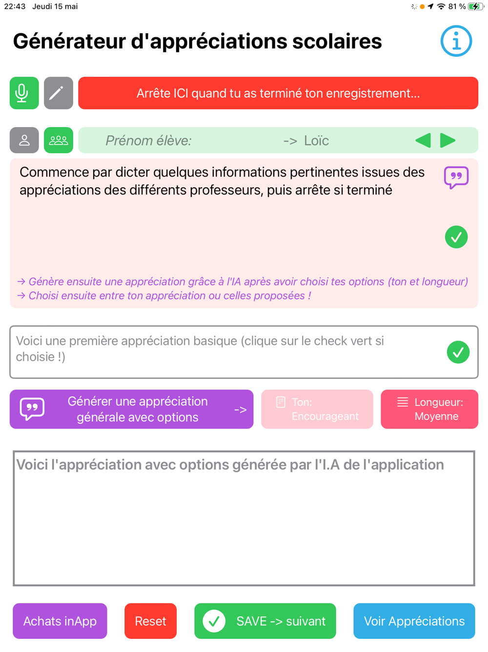 Vous êtes enseignant et devez rédiger des appréciations générales pour vos élèves ? Cette application vous fait gagner un temps précieux en générant automatiquement des textes adaptés à partir de remarques dictées ou saisies via une interface simple et intuitive.