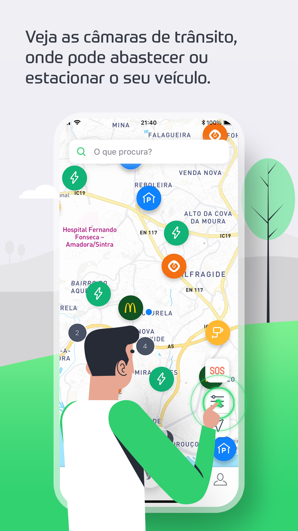 Aceda às câmaras e aos alertas de trânsito. Consulte os parques de estacionamento onde pode pagar com Via Verde, do Norte ao Sul do país. Veja onde pode abastecer ou carregar o seu veículo e ainda os locais onde pode apanhar o ferry. De forma intuitiva e simples, na app Via Verde!