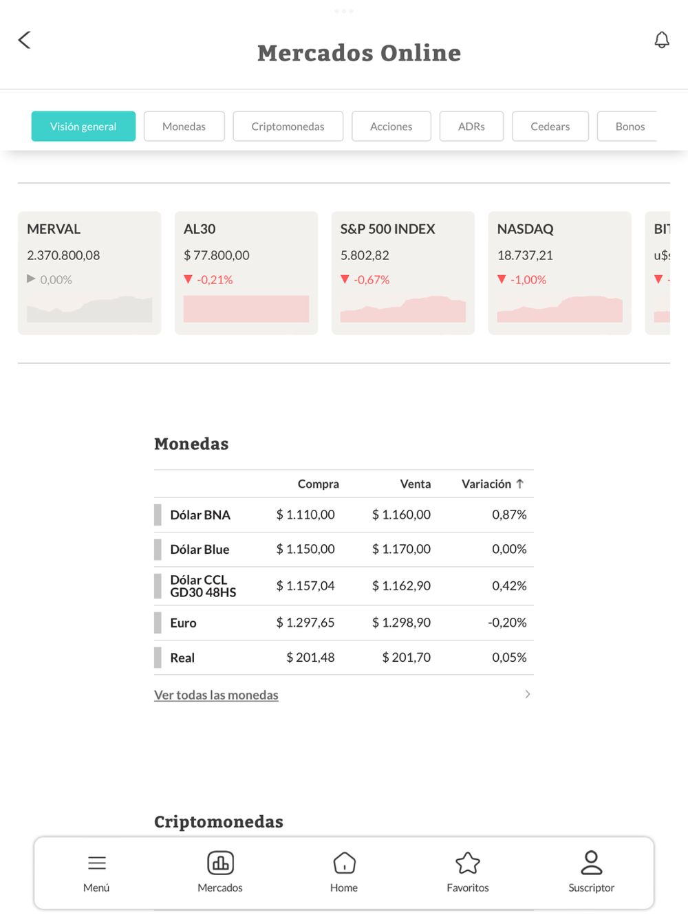 Mantenete al tanto de las cotizaciones del dólar (dólar hoy), bonos, acciones (cedears), commodities, impuestos y las últimas tendencias del mercado, todo en una plataforma intuitiva.