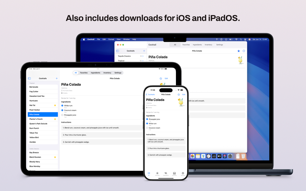 Runs natively on iPhone, iPad, and macOS—complete with adaptive layouts, Retina-quality images, and Dark Mode support.