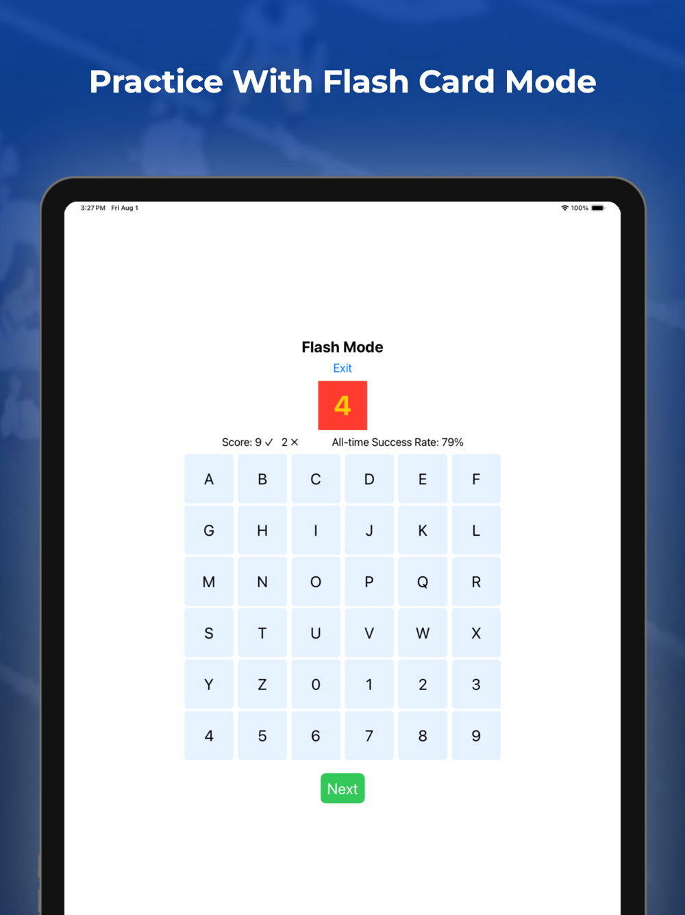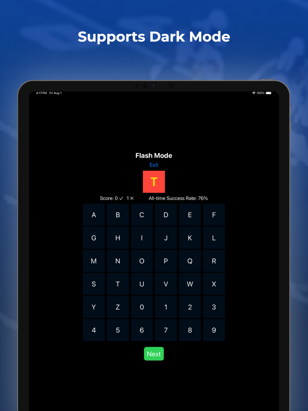 • Flashcard Mode – Hear a Morse character, then tap your answer. Get instant feedback, track your accuracy, and build confidence with each round.