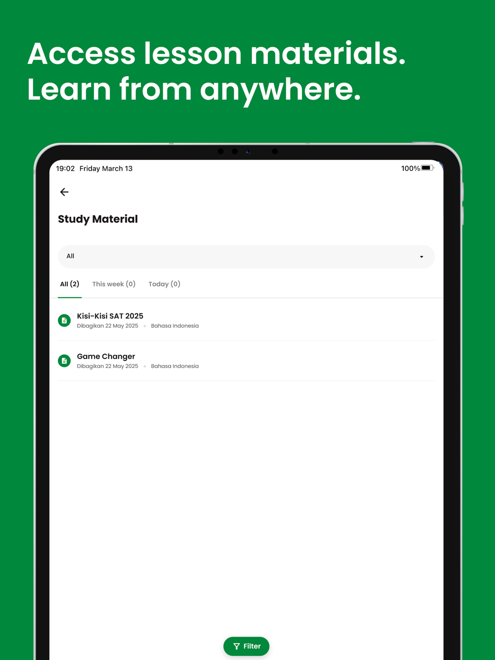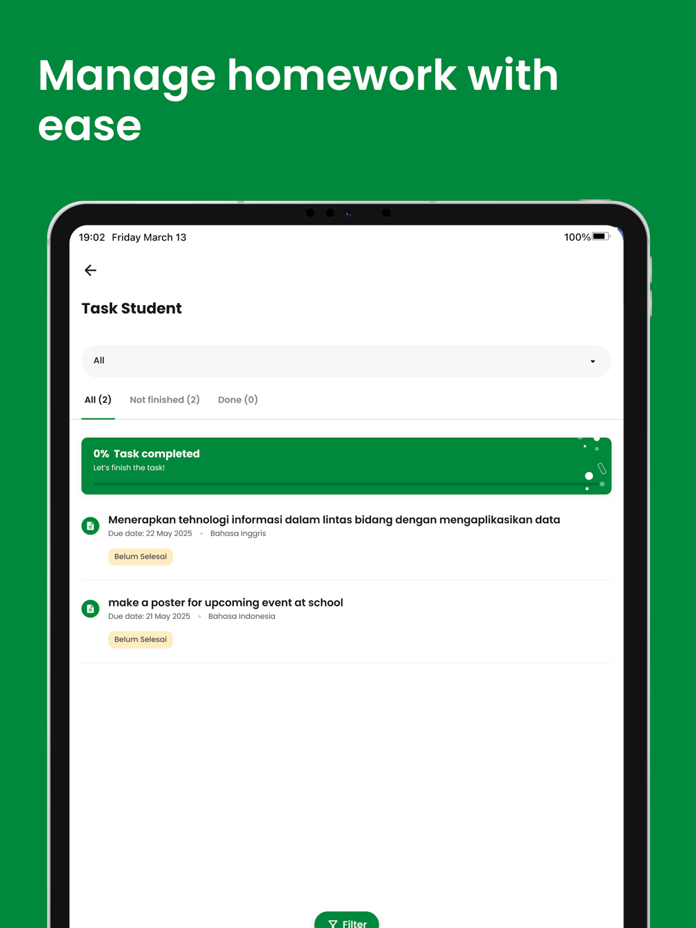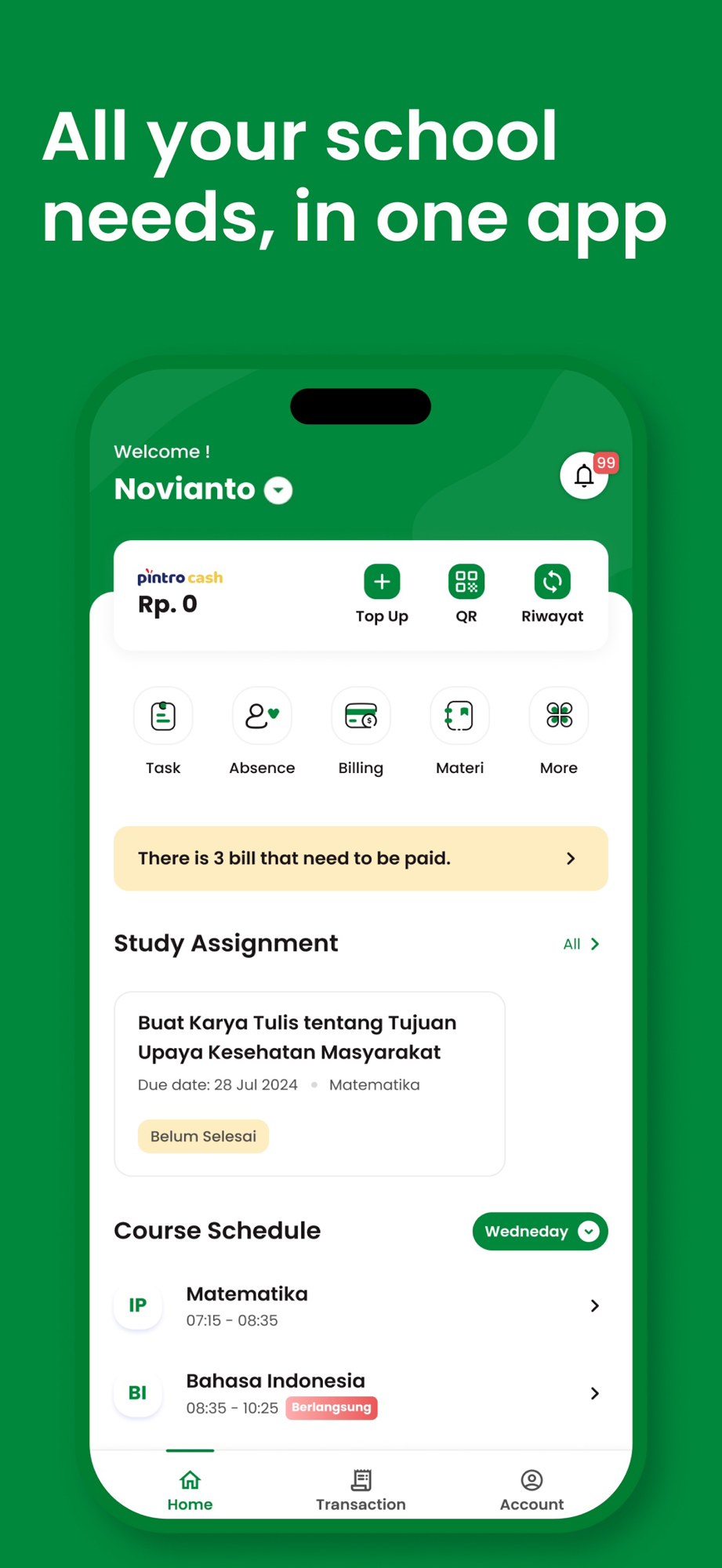 Orang tua dan siswa dapat menggunakan LMS untuk mendukung proses pembelajaran secara efisien. Fitur ini mencakup pengelolaan absensi, melihat jadwal pelajaran, mengakses materi belajar, mengirim dan meninjau tugas, mengecek jadwal ujian, mengikuti ujian online, serta menerima pembaruan terkait aktivitas akademik. Selain itu, orang tua juga dapat dengan mudah memantau pembayaran tagihan pendidikan melalui aplikasi.