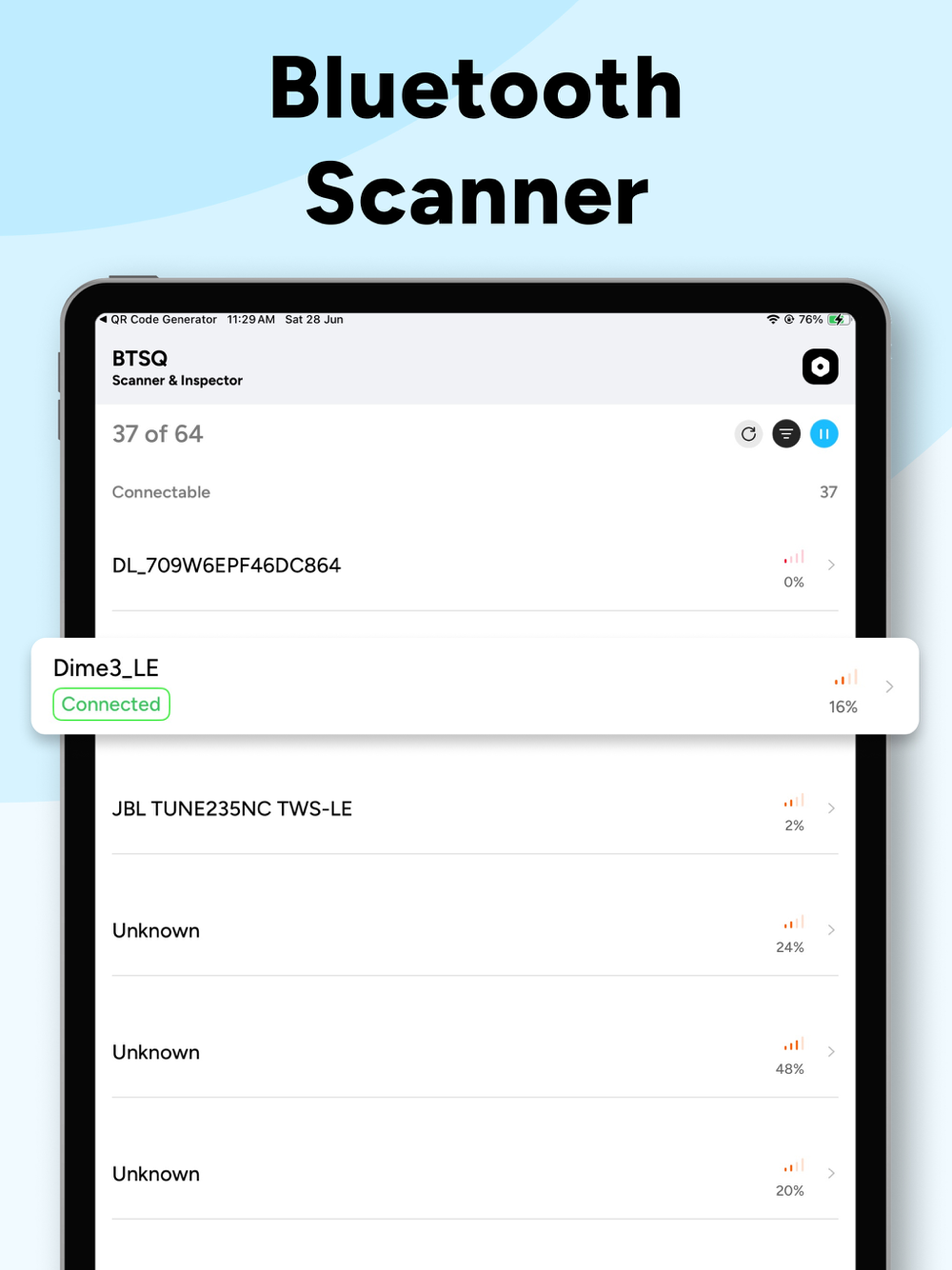 Bluetooth Scanner - BTSQ keeps it simple! It is designed to be efficient and focused on the user experience, ensuring that anyone needing Bluetooth information in real-time, can accomplish this smoothly. It is an effective tool for occasional casual user, to a user that regularly operates wireless devices.
