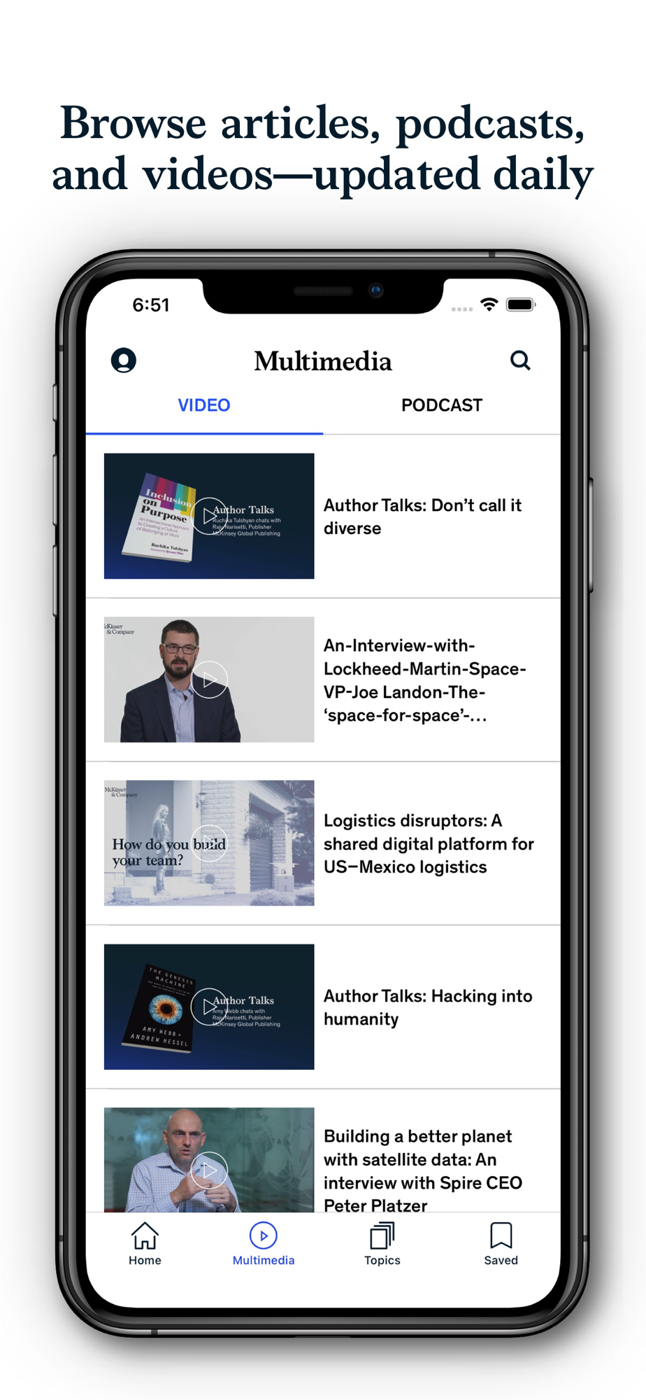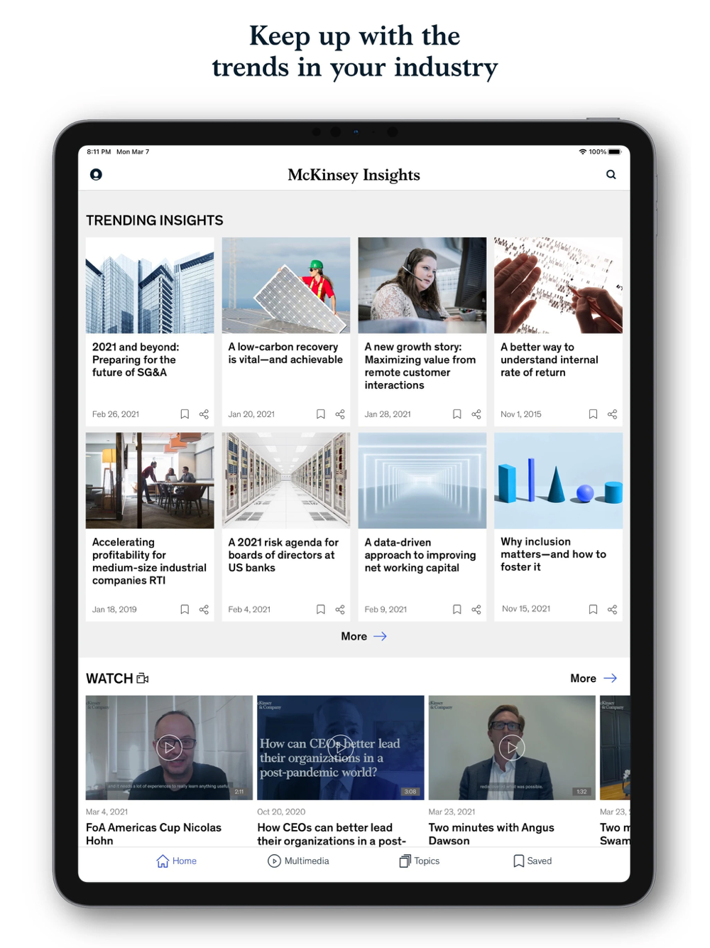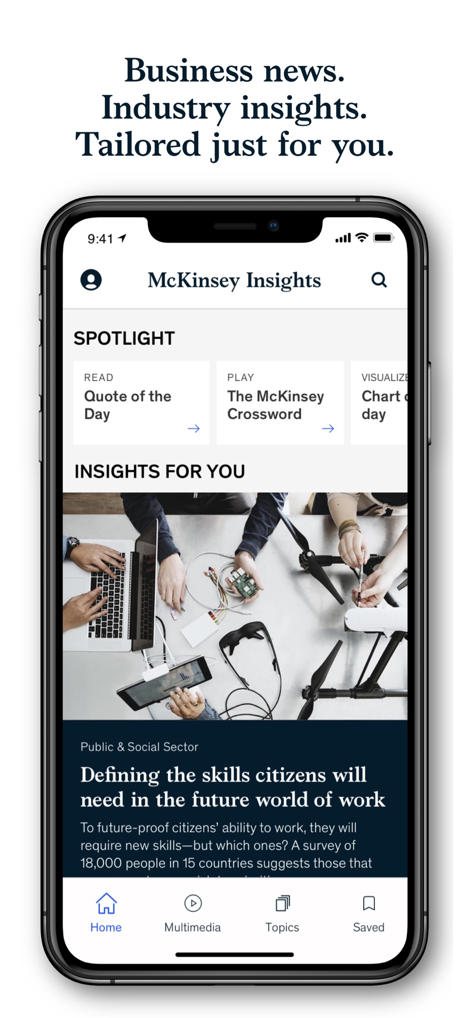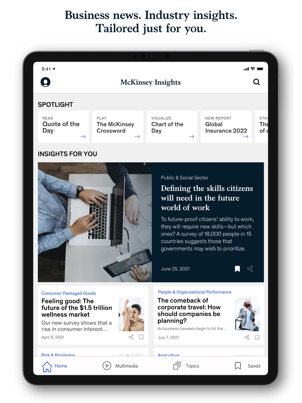 The McKinsey Insights app offers business news and analysis on the biggest issues facing senior executives today--from leadership and corporate strategy to the future of work and AI’s impact on business and society. In addition, explore new articles on digitization, marketing, and analytics, across industries such as consumer goods, financial services, and tech. In fresh content updated daily, McKinsey consultants and contributing experts look at the latest in climate change, diversity and inclusion in the workplace, organizational restructuring, bringing data to bear on business strategy, and more. Content includes articles from McKinsey Quarterly, reports from the McKinsey Global Institute, podcasts, and videos.