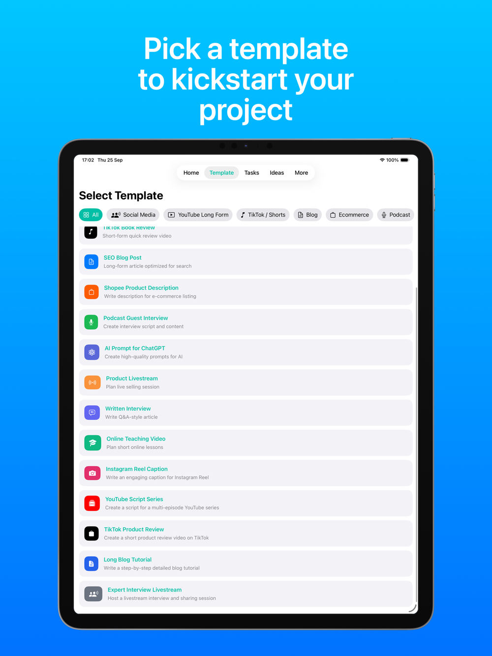 Capture ideas instantly. Convert voice notes into tasks, captions, or long-form drafts without typing.