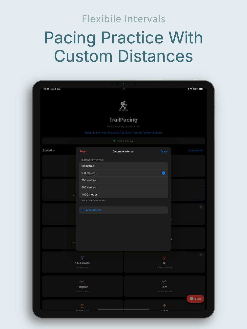 TrailPacing is a GPS-based hiking app that helps you monitor your performance with customizable distance interval notifications. Track your current speed, average pace, elevation changes, and distance covered while receiving alerts at your chosen intervals to help maintain your target pace throughout your hike.