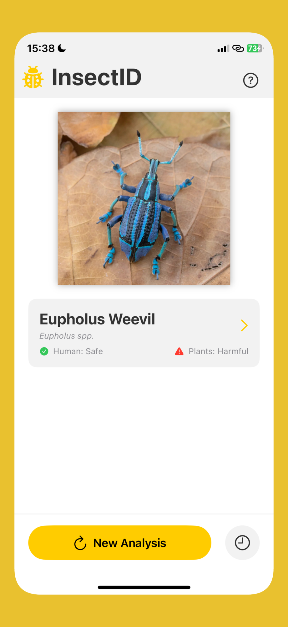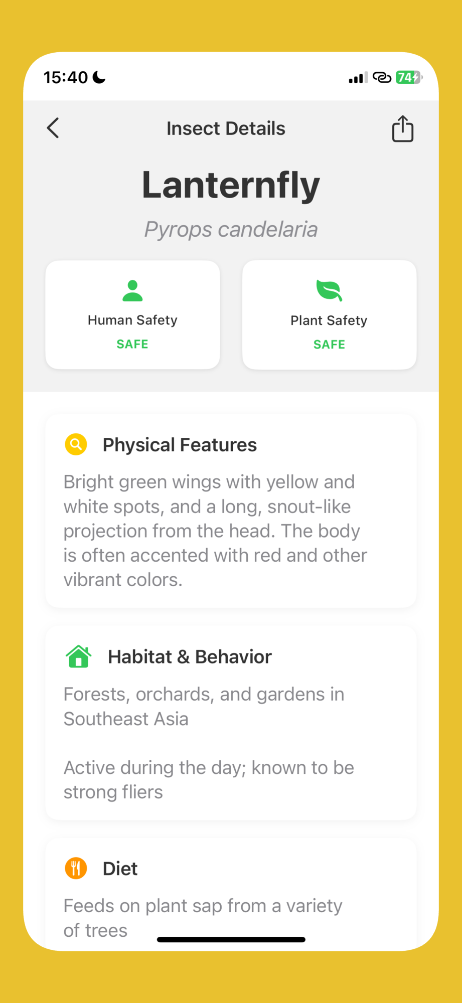 Save Your Discoveries: Build your personal digital collection of insect encounters. Save all your past identifications with photos and details to track your findings and refer back anytime.