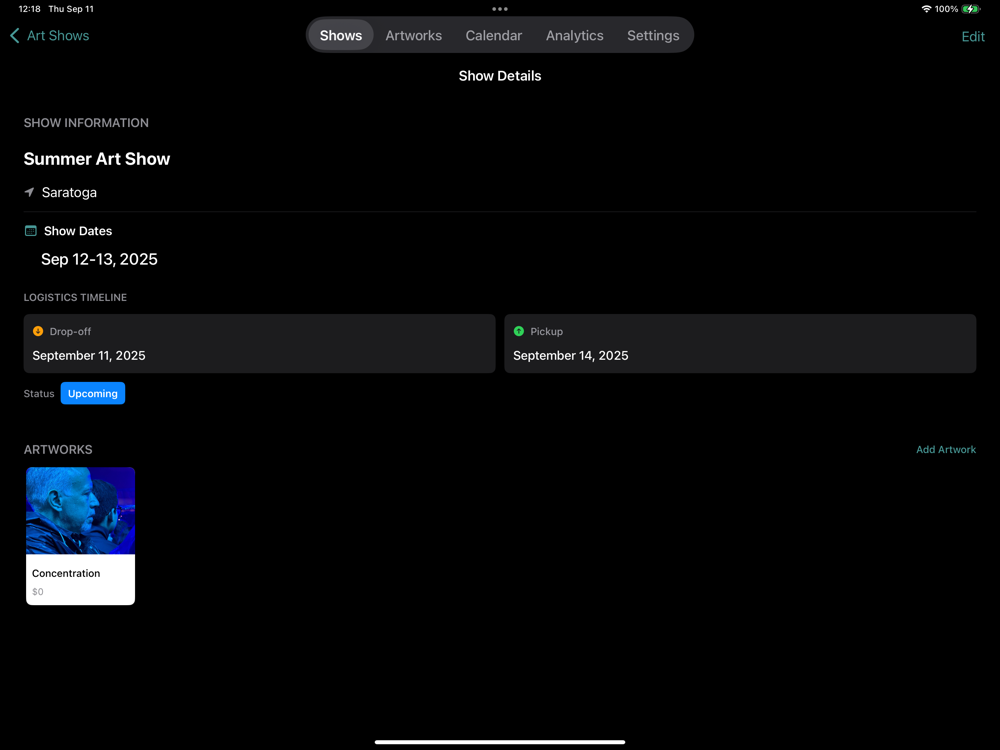 Show Management: Add venues, dates, and notes for all your exhibitions.