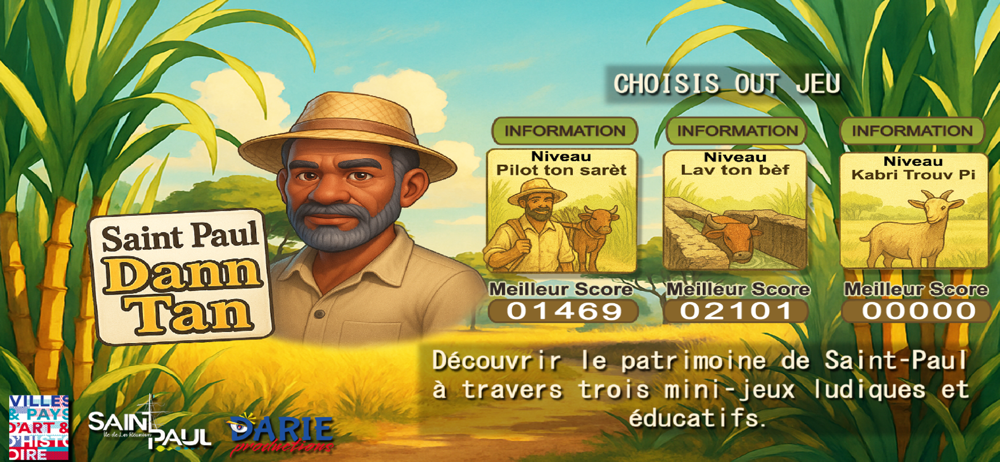 Saint-Paul Dann Tan (Saint-Paul dans le temps d’avant) est un jeu vidéo éducatif qui fait voyager les enfants au cœur du patrimoine culturel et historique de Saint-Paul (La Réunion).
