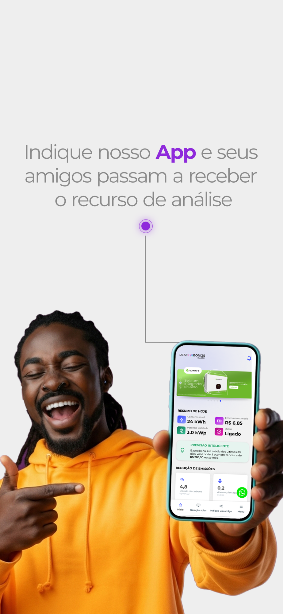 O app oficial da Descarbonize Soluções foi criado para trazer clareza, praticidade e insights inteligentes para proprietários e gestores de usinas solares.