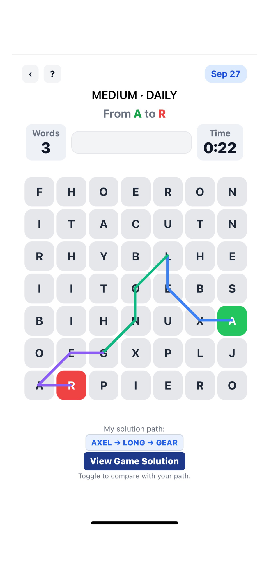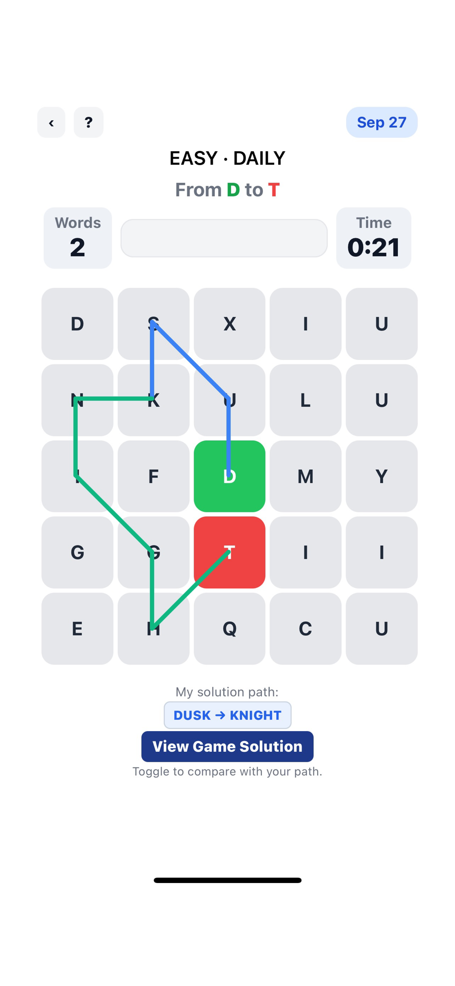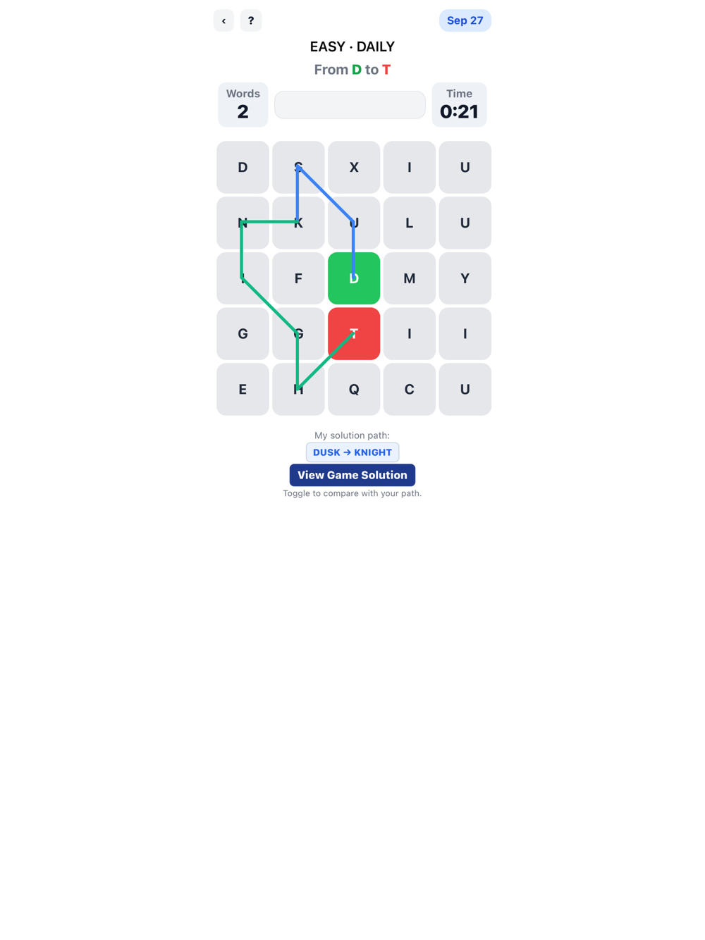 Knottled is a daily path‑finding word game. Connect adjacent letters to form words, clear the grid, and see how fast you can solve today’s puzzle. New puzzles every day.
