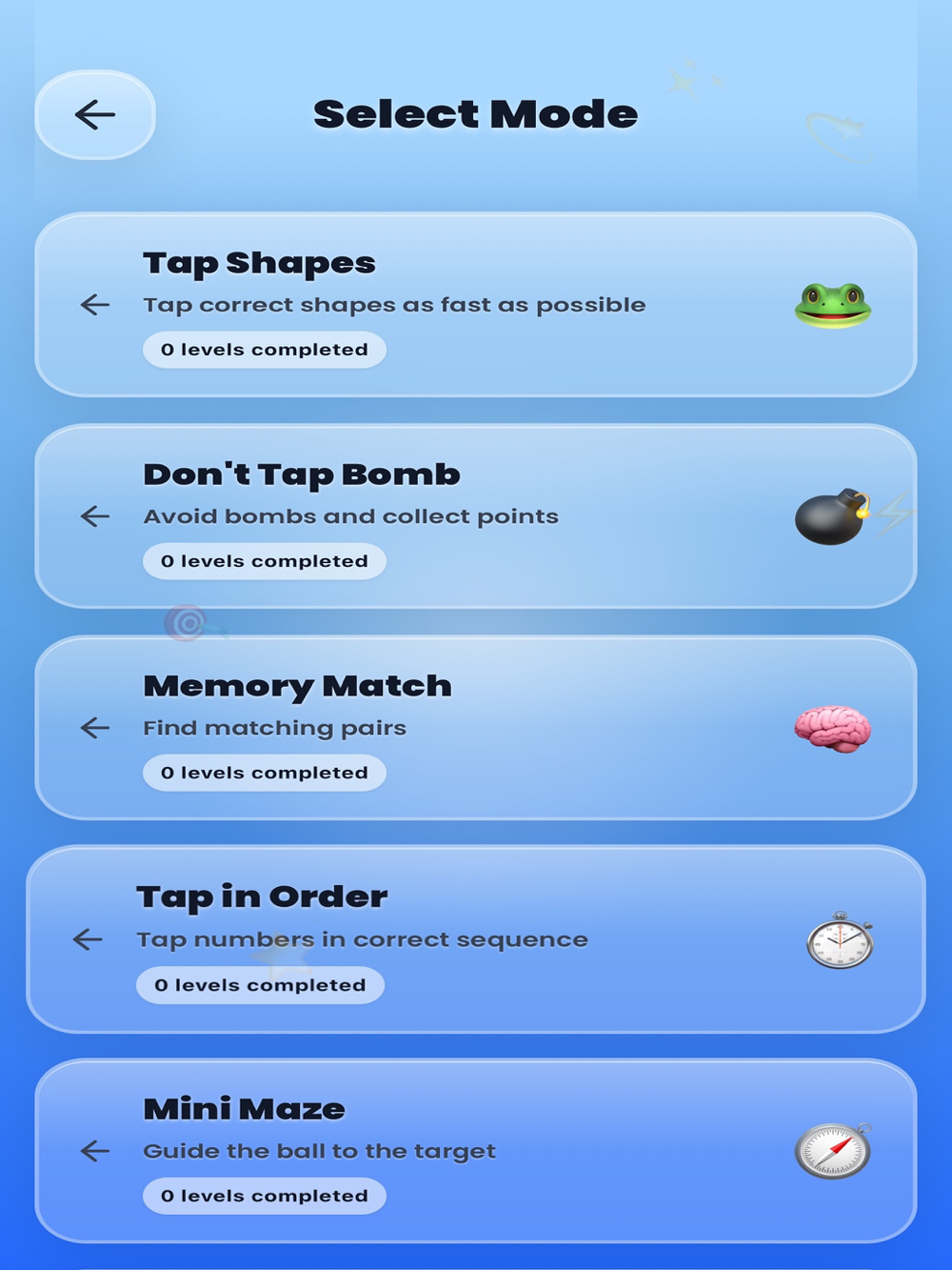 أكثر من 20 لعبة متنوعة لاختبار التركيز، الذاكرة، السرعة، وردة الفعل.