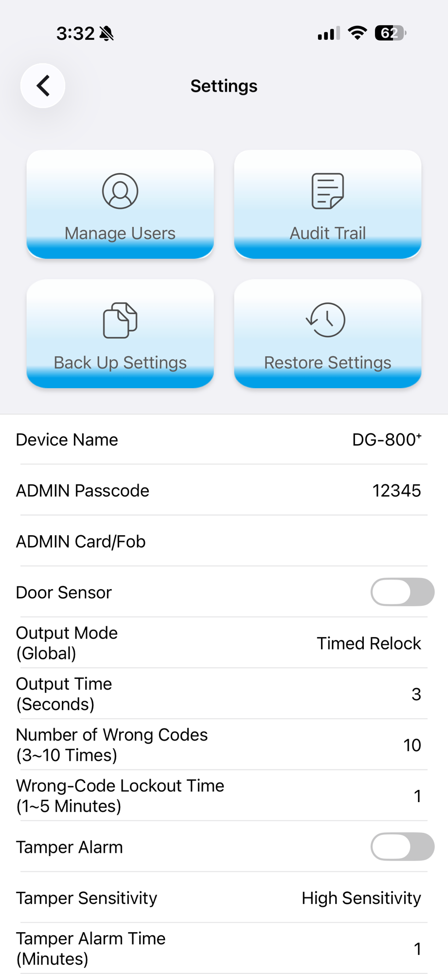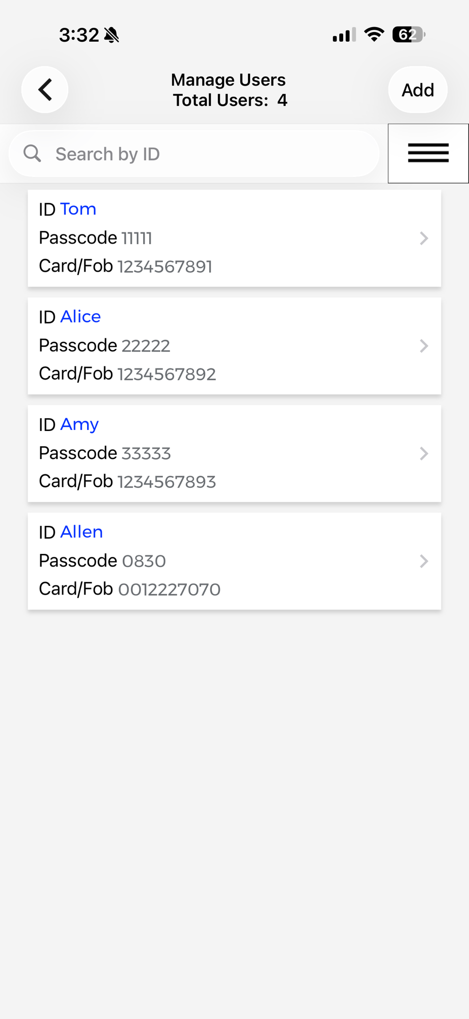- Add user cards or key fobs to unlock.