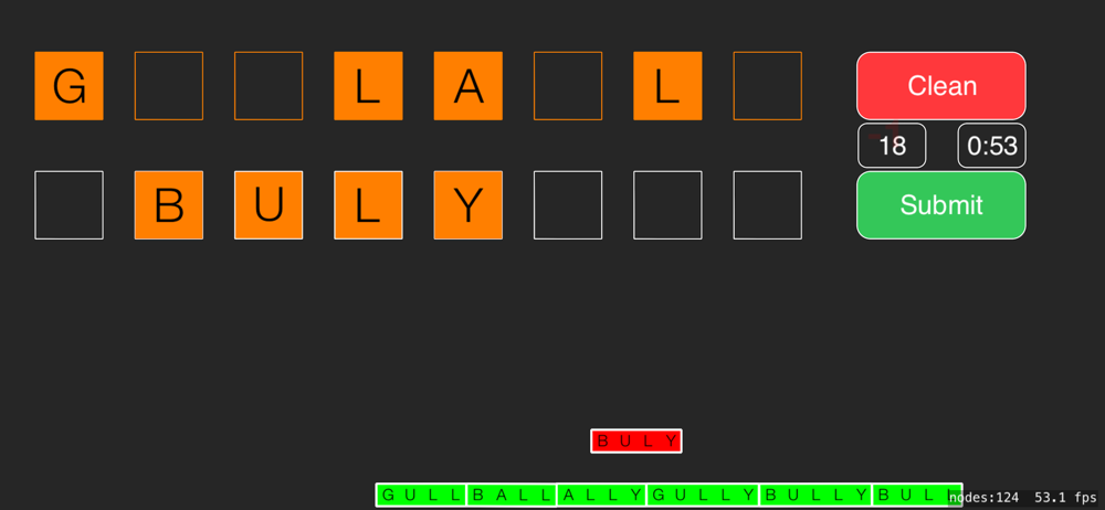 Anagram game. Create as many words out of a 8 letter root word. Extra points awarded for length and randomness of letter arrangement. Try playing using a Spanish dictionary for a linguistic challenge.
