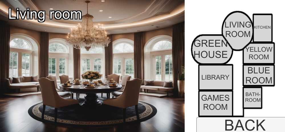 This app displays rooms in a house. You can view each room at any time until you become familiar with them. When you select "Place 1 Picture," a famous painting will be randomly placed in each room. Once you've viewed them, you can go to the "Check Memory" option, where you can indicate which paintings were in each room. When you place them all, you'll be informed of how many you guessed correctly. This can also be done by placing two pictures using the "Place 2 Pictures" option. You can then check your memory of their location.