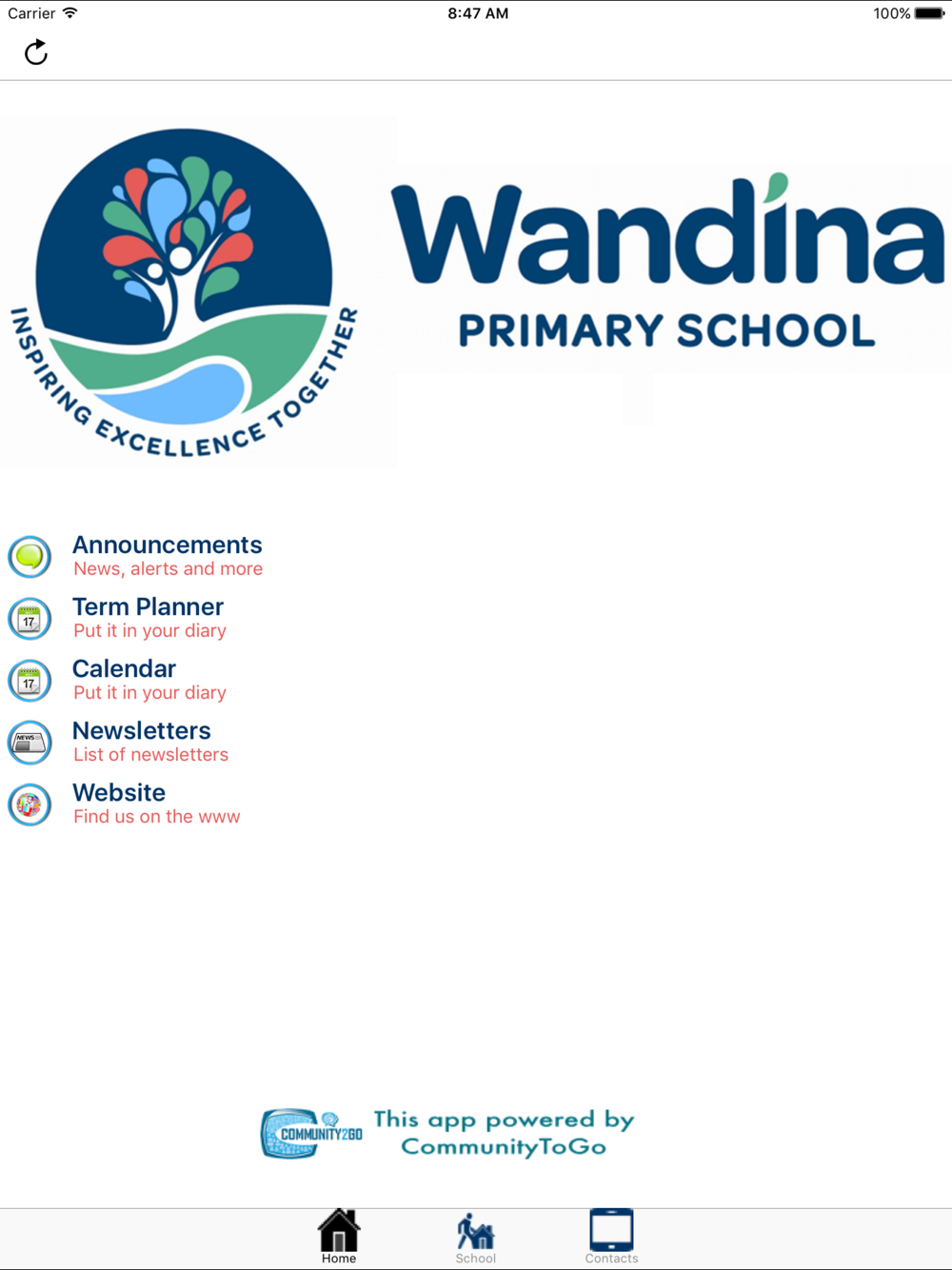 This app is for the community of Wandina Primary School in Geraldton, Western Australia. It allows easy access to school documents and information, and parents will hear news from the school via push notifications. Parents and future students will enjoy seeing the school take shape in the gallery