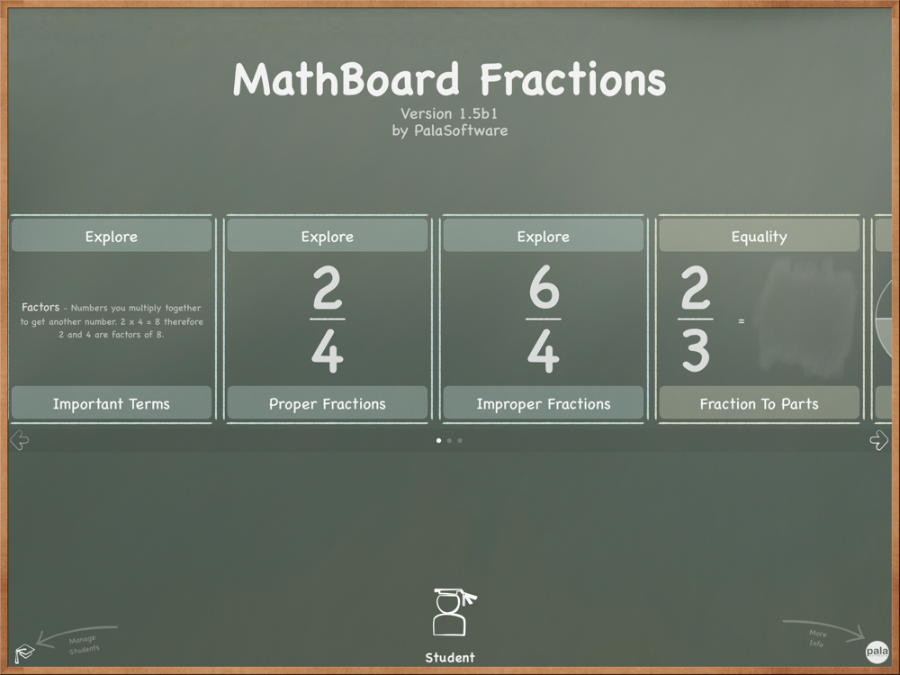 MathBoard Fractions is a comprehensive fractions app that will help all students master fractions easily. MathBoard Fractions consists of activities that will teach terms, provide interactive examples, quiz knowledge, as well as walk through solutions.