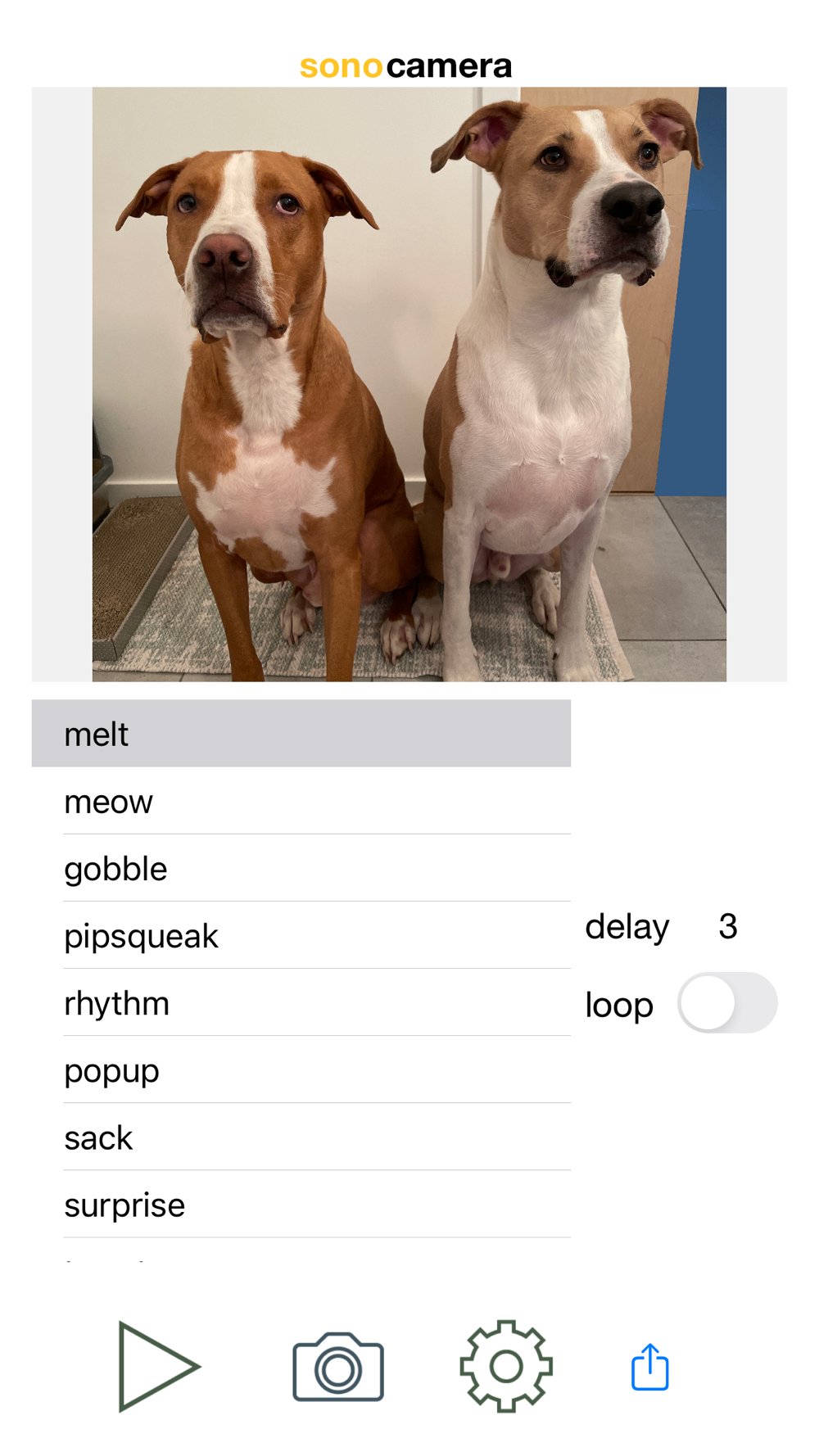 Sonocamera is a combination camera app and attention getter for your pets and friends. Find the audio that grabs their attention and capture a memory. Post it to your Facebook or Twitter account.