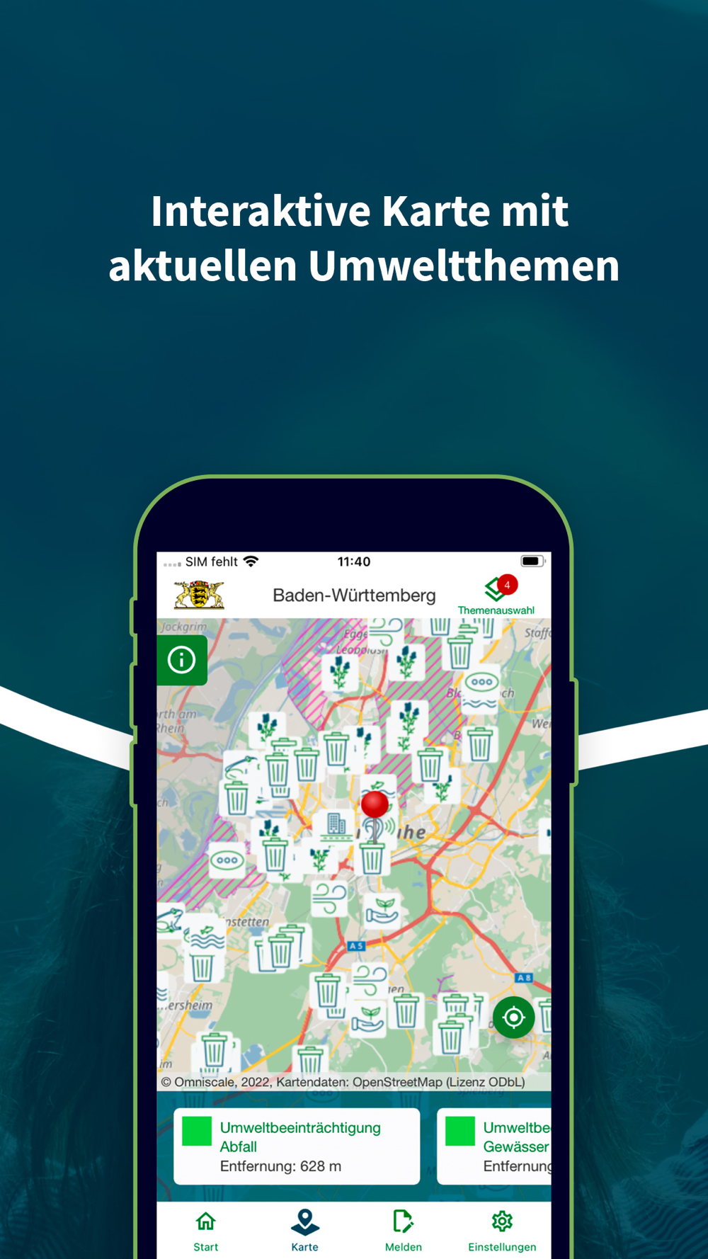 • Melden Sie in Baden-Württemberg, Thüringen und Sachsen-Anhalt Umweltbeeinträchtigungen durch Luftverschmutzung, Lärm, Gewässerverunreinigung, Abfallablagerung oder andere Schäden an Natur und Landschaft.