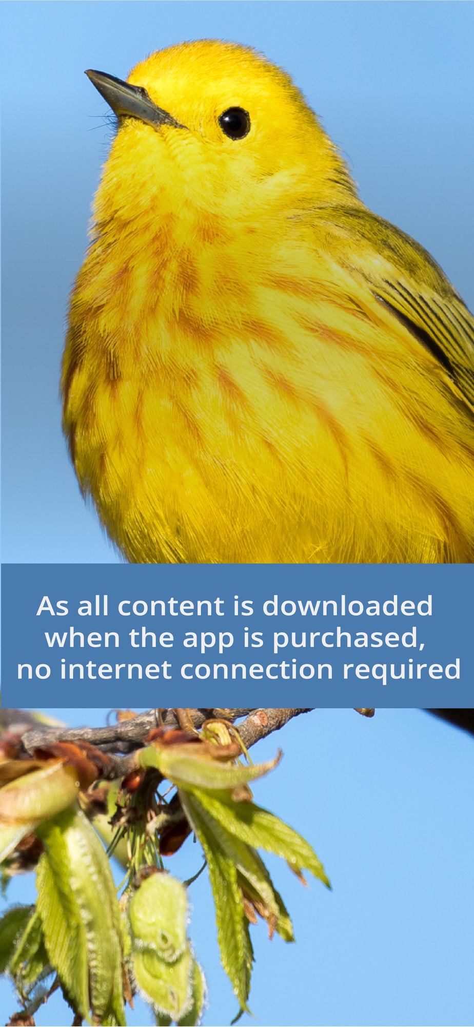 Identify birds of the USA with this stunning guide! Includes high quality images, plus songs and calls. No internet connection is needed. Record your own bird sightings with GPS position and photo too.