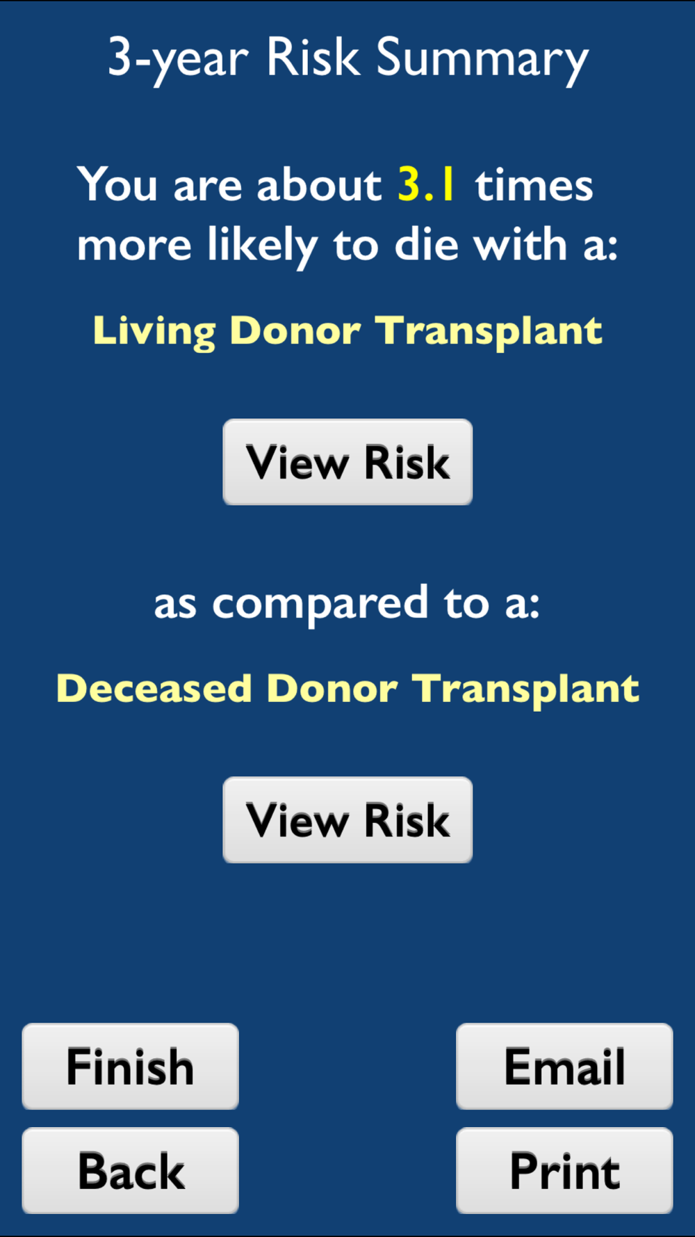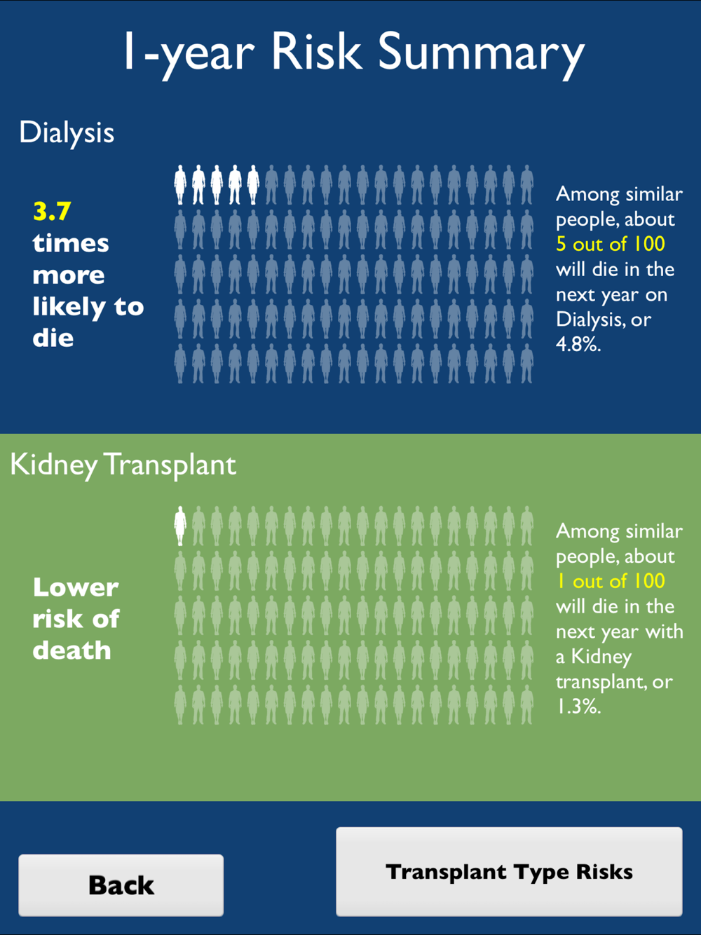 The iCHOOSE mobile application and corresponding website is expected to serve as a decision support tool for nephrologists, primary care physicians, social workers, nurses, and/or patient educators to use with ESRD patients to help improve informed decision making for kidney failure treatment options. Risk prediction models for mortality on dialysis of kidney transplantation are presented.