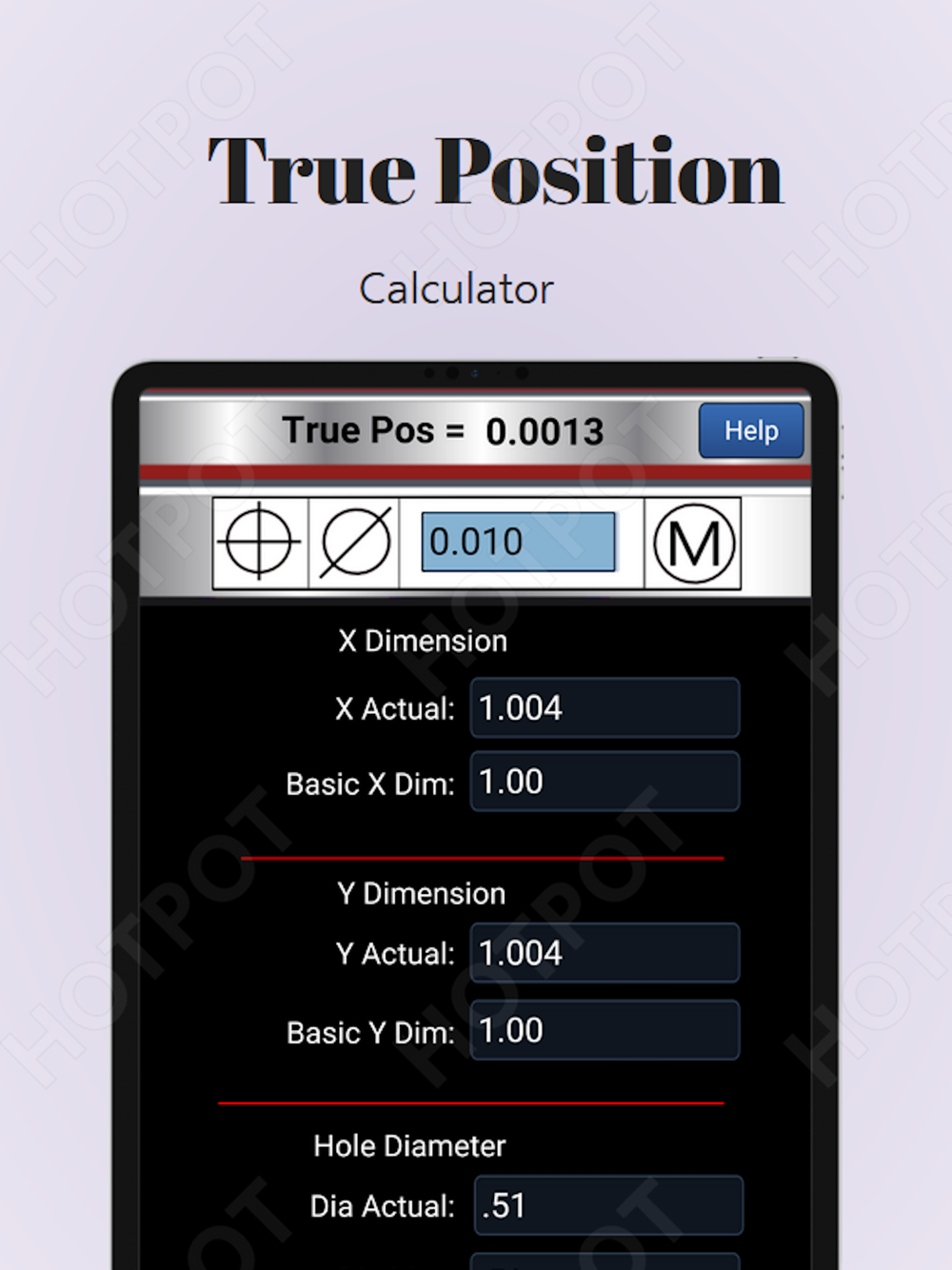 A calculator for finding the true position of holes. Enter the dimensions and tolerances from the engineering drawing.