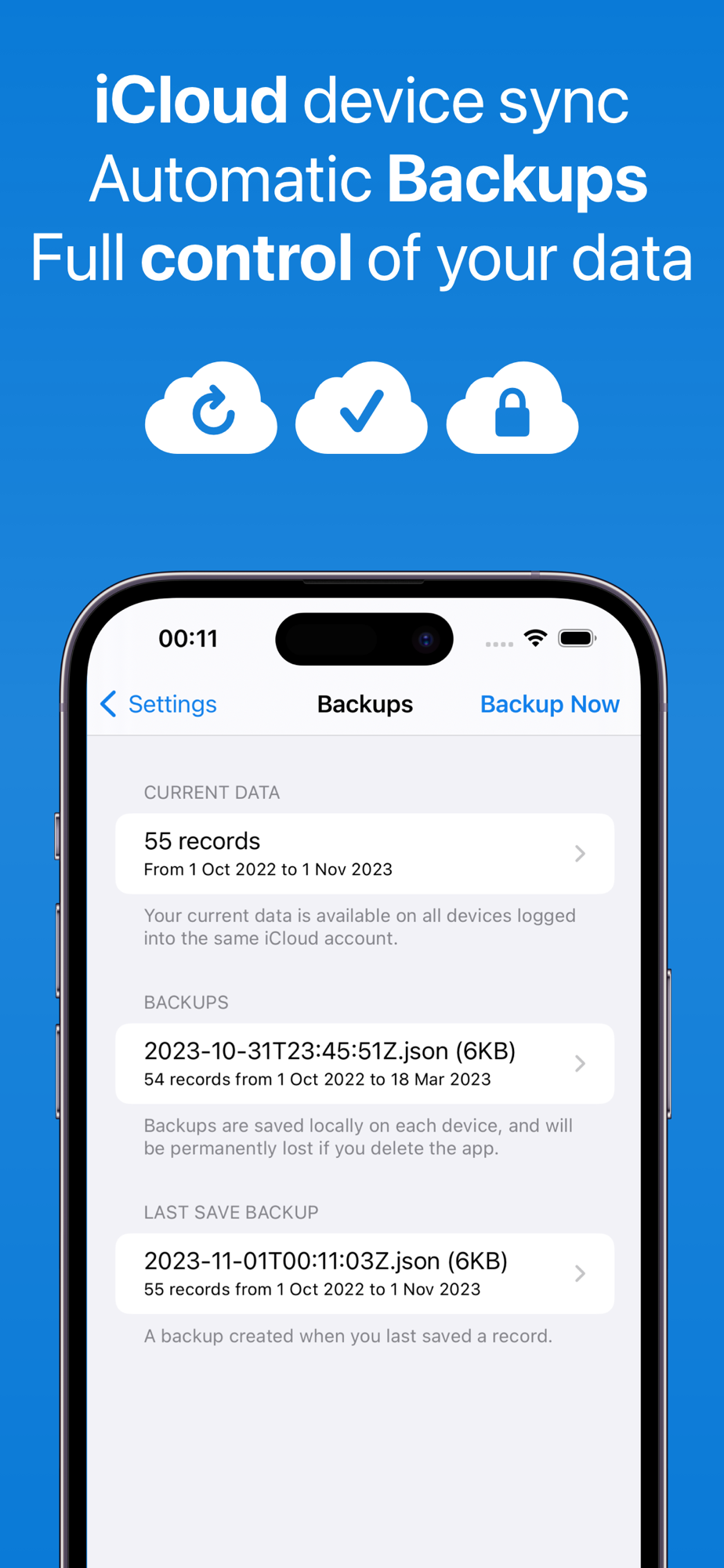 • iCloud sync. Automatic and manual backups.